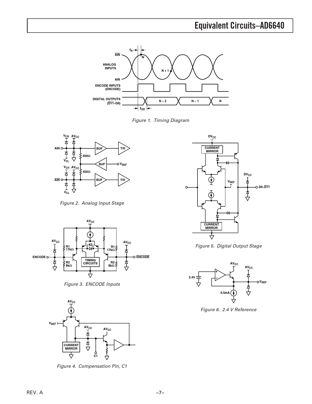 Equivalent Circuits–AD6640tAAINNANALOGINPUTSN + 1AINENCODE INPUTS(ENCODE)DIGITAL OUTPUTSN – 2N – 1N(D11–D0)tOD Figure 1. Timing Diagram VCH AVCCDVCCAINBUFT/HCURRENTMIRROR450 ⍀ VCLBUFVREFVCH AVCC450 ⍀ DVCCAINBUFT/HVREFD0–D11VCL Figure 2. Analog Input Stage AVCCCURRENTMIRRORAVCCAVCCR1R1 Figure 5. Digital Output Stage 17k ⍀ 17k ⍀ ENCODEENCODETIMINGR2CIRCUITSR2AV8k ⍀ 8k ⍀ CCAVCC2.4VV Figure 3. ENCODE Inputs REF0.5mAAVCC Figure 6. 2.4 V Reference VREFAVCCAVCCCURRENTMIRRORC1 Figure 4. Compensation Pin, C1 REV. A –7– Document Outline FEATURES APPLICATIONS GENERAL DESCRIPTION FUNCTIONAL BLOCK DIAGRAM PRODUCT HIGHLIGHTS SPECIFICATIONS DC SPECIFICATIONS DIGITAL SPECIFICATIONS SWITCHING SPECIFICATIONS AC SPECIFICATIONS ABSOLUTE MAXIMUM RATINGS EXPLANATION OF TEST LEVELS ORDERING GUIDE PIN FUNCTION DESCRIPTIONS PIN CONFIGURATION DEFINITION OF SPECIFICATIONS Analog Bandwidth (Small Signal) Aperture Delay Aperture Uncertainty (Jitter) Differential Nonlinearity Encode Pulsewidth/Duty Cycle Integral Nonlinearity Minimum Conversion Rate Maximum Conversion Rate Output Propagation Delay Power Supply Rejection Ratio Signal-to-Noise-and-Distortion (SINAD) Signal-to-Noise Ratio (SNR) Spurious-Free Dynamic Range (SFDR) Two-Tone Intermodulation Distortion Rejection Two-Tone SFDR Worst Harmonic Equivalent Circuits Typical Performance Characteristics THEORY OF OPERATION APPLYING THE AD6640 Encoding the AD6640 Driving the Analog Input Power Supplies Output Loading Layout Information Evaluation Boards DIGITAL WIDEBAND RECEIVERS Introduction System Description System Requirements Noise Floor and SNR Processing Gain Overcoming Static Nonlinearities with Dither Receiver Example IF Sampling Using the AD6640 as a Mix-Down Stage RECEIVE CHAIN FOR A PHASED-ARRAY CELLULAR BASE STATION OUTLINE DIMENSIONS Revision History