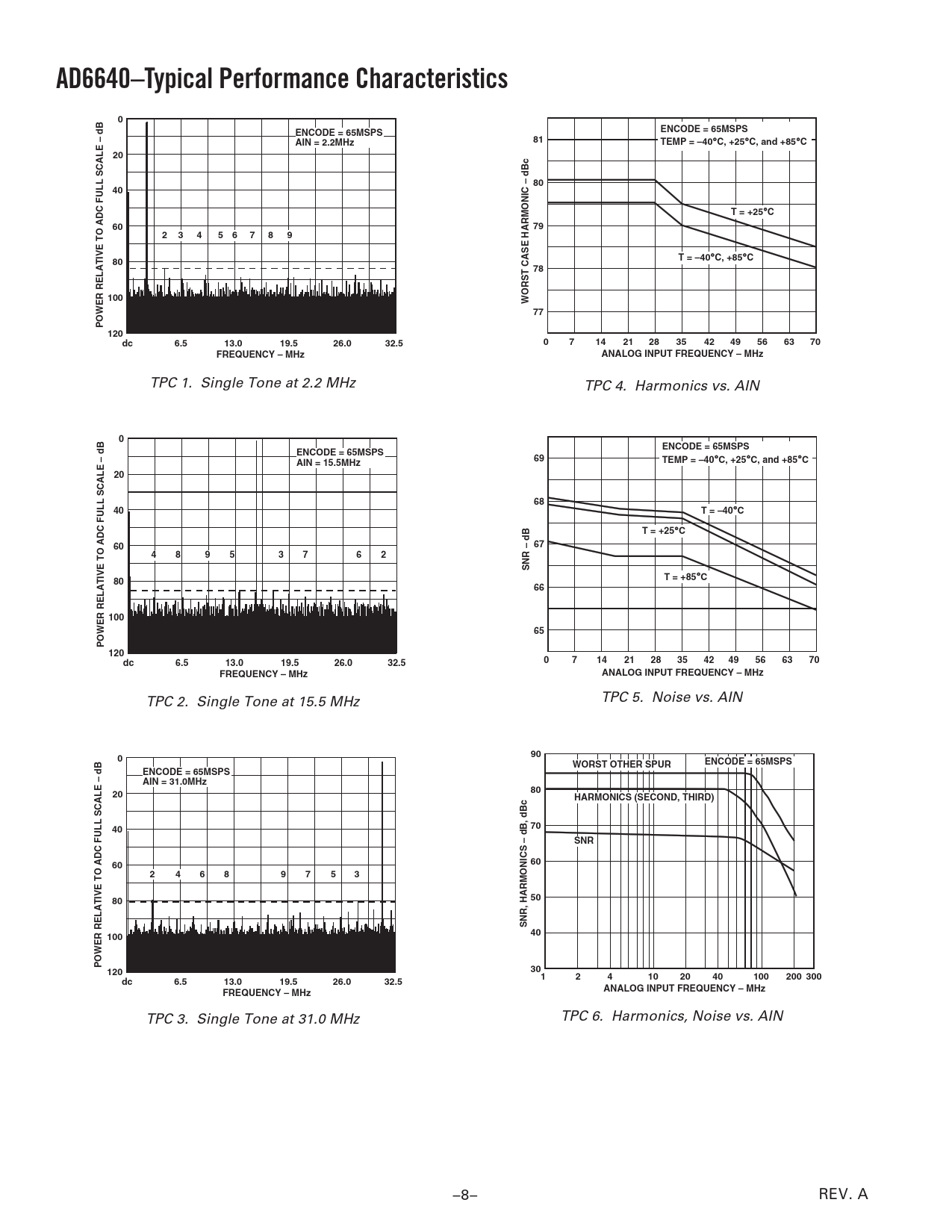 AD6640–Typical Performance Characteristics0ENCODE = 65MSPSENCODE = 65MSPSAIN = 2.2MHz81TEMP = –40 C, +25 C, and +85 C208040T = +25 C607923456789T = –40 C, +85 C8078100WORST CASE HARMONIC – dBc77POWER RELATIVE TO ADC FULL SCALE – dB 120dc6.513.019.526.032.507142128354249566370FREQUENCY – MHzANALOG INPUT FREQUENCY – MHz TPC 1. Single Tone at 2.2 MHz TPC 4. Harmonics vs. AIN 0ENCODE = 65MSPSENCODE = 65MSPS69AIN = 15.5MHzTEMP = –40 C, +25 C, and +85 C206840T = –40 CT = +25 C606748953762SNR – dBT = +85 C806610065POWER RELATIVE TO ADC FULL SCALE – dB120dc6.513.019.526.032.507142128354249566370FREQUENCY – MHzANALOG INPUT FREQUENCY – MHz TPC 2. Single Tone at 15.5 MHz TPC 5. Noise vs. AIN 090ENCODE = 65MSPSWORST OTHER SPURENCODE = 65MSPS AIN = 31.0MHz8020HARMONICS (SECOND, THIRD)4070SNR6060246897538050SNR, HARMONICS – dB, dBc10040POWER RELATIVE TO ADC FULL SCALE – dB 12030124102040100200 300dc6.513.019.526.032.5ANALOG INPUT FREQUENCY – MHzFREQUENCY – MHz TPC 3. Single Tone at 31.0 MHz TPC 6. Harmonics, Noise vs. AIN –8– REV. A Document Outline FEATURES APPLICATIONS GENERAL DESCRIPTION FUNCTIONAL BLOCK DIAGRAM PRODUCT HIGHLIGHTS SPECIFICATIONS DC SPECIFICATIONS DIGITAL SPECIFICATIONS SWITCHING SPECIFICATIONS AC SPECIFICATIONS ABSOLUTE MAXIMUM RATINGS EXPLANATION OF TEST LEVELS ORDERING GUIDE PIN FUNCTION DESCRIPTIONS PIN CONFIGURATION DEFINITION OF SPECIFICATIONS Analog Bandwidth (Small Signal) Aperture Delay Aperture Uncertainty (Jitter) Differential Nonlinearity Encode Pulsewidth/Duty Cycle Integral Nonlinearity Minimum Conversion Rate Maximum Conversion Rate Output Propagation Delay Power Supply Rejection Ratio Signal-to-Noise-and-Distortion (SINAD) Signal-to-Noise Ratio (SNR) Spurious-Free Dynamic Range (SFDR) Two-Tone Intermodulation Distortion Rejection Two-Tone SFDR Worst Harmonic Equivalent Circuits Typical Performance Characteristics THEORY OF OPERATION APPLYING THE AD6640 Encoding the AD6640 Driving the Analog Input Power Supplies Output Loading Layout Information Evaluation Boards DIGITAL WIDEBAND RECEIVERS Introduction System Description System Requirements Noise Floor and SNR Processing Gain Overcoming Static Nonlinearities with Dither Receiver Example IF Sampling Using the AD6640 as a Mix-Down Stage RECEIVE CHAIN FOR A PHASED-ARRAY CELLULAR BASE STATION OUTLINE DIMENSIONS Revision History