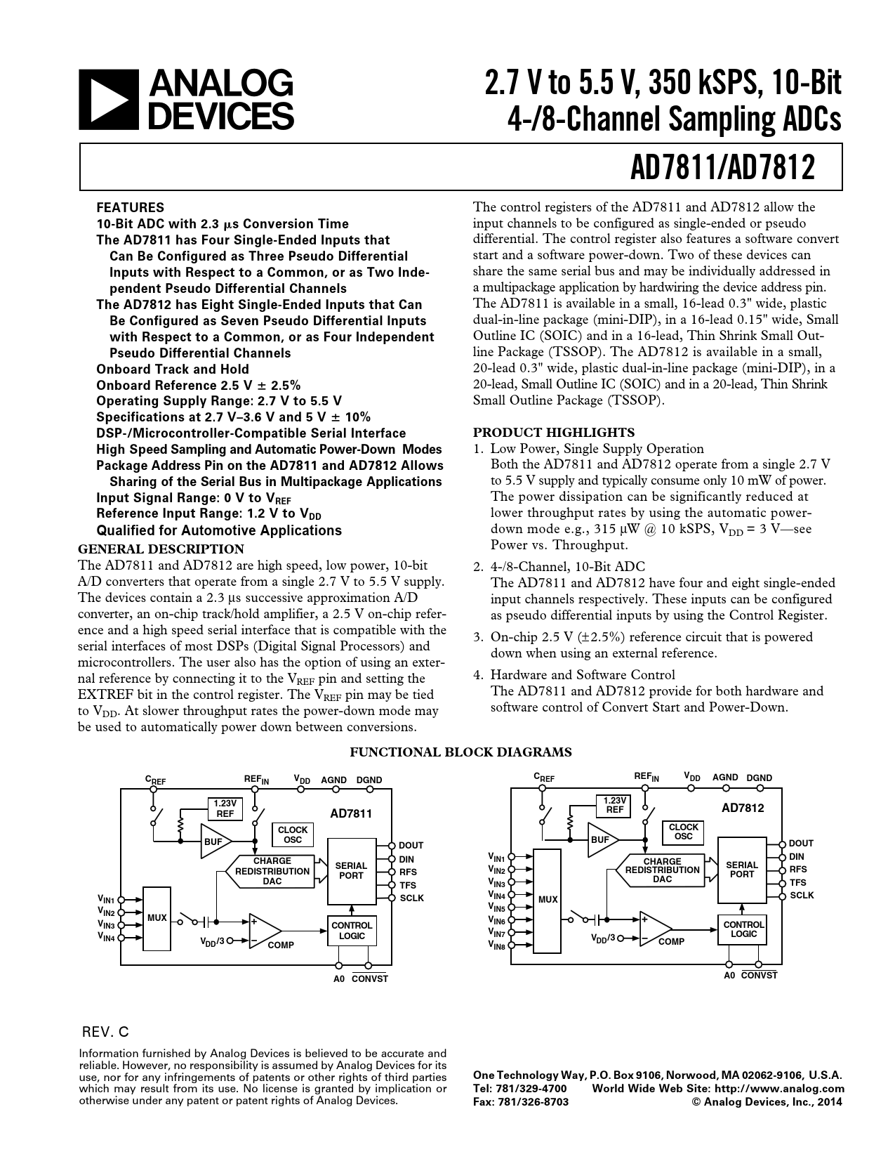 2.7 V to 5.5 V, 350 kSPS, 10-Bit. 4-/8-Channel Sampling ADCs. AD7811/AD7812. FEATURES. 10-Bit ADC with 2.3. s Conversion Time