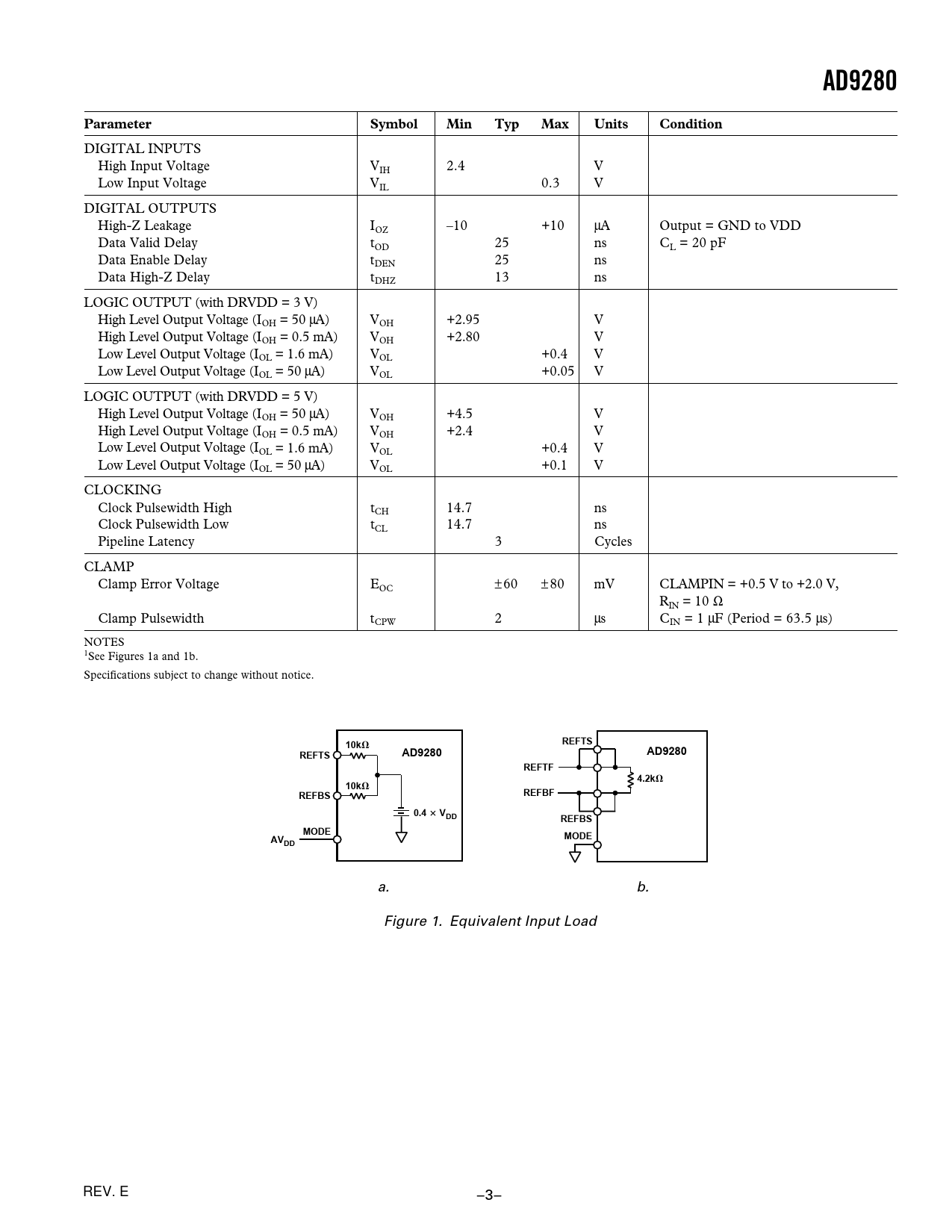 DIGITAL INPUTS High Input Voltage VIH 2.4 V Low Input Voltage VIL 0.3 V DIGITAL OUTPUTS High-Z Leakage IOZ –10 +10 µA Output = GND to VDD Data Valid Delay tOD 25 ns CL = 20 pF Data Enable Delay tDEN 25 ns Data High-Z Delay tDHZ 13 ns LOGIC OUTPUT (with DRVDD = 3 V) High Level Output Voltage (IOH = 50 µA) VOH +2.95 V High Level Output Voltage (IOH = 0.5 mA) VOH +2.80 V Low Level Output Voltage (IOL = 1.6 mA) VOL +0.4 V Low Level Output Voltage (IOL = 50 µA) VOL +0.05 V LOGIC OUTPUT (with DRVDD = 5 V) High Level Output Voltage (IOH = 50 µA) VOH +4.5 V High Level Output Voltage (IOH = 0.5 mA) VOH +2.4 V Low Level Output Voltage (IOL = 1.6 mA) VOL +0.4 V Low Level Output Voltage (IOL = 50 µA) VOL +0.1 V CLOCKING Clock Pulsewidth High tCH 14.7 ns Clock Pulsewidth Low tCL 14.7 ns Pipeline Latency 3 Cycles CLAMP Clamp Error Voltage E ± OC 60 ±80 mV CLAMPIN = +0.5 V to +2.0 V, RIN = 10 Ω Clamp Pulsewidth tCPW 2 µs CIN = 1 µF (Period = 63.5 µs) NOTES 1See Figures 1a and 1b. Specifications subject to change without notice.