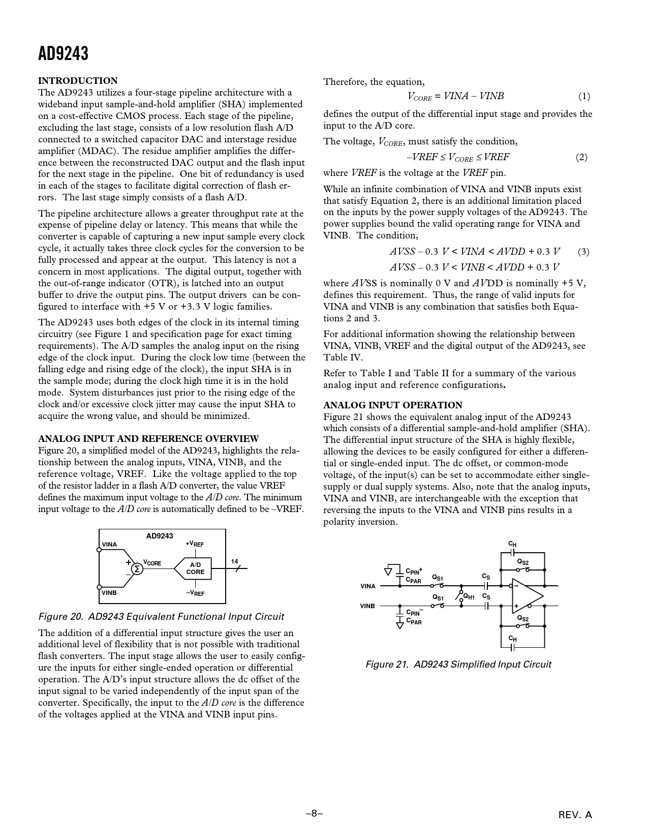 acquire the wrong value, and should be minimized. Figure 21 shows the equivalent analog input of the AD9243 which consists of a differential sample-and-hold amplifier (SHA).