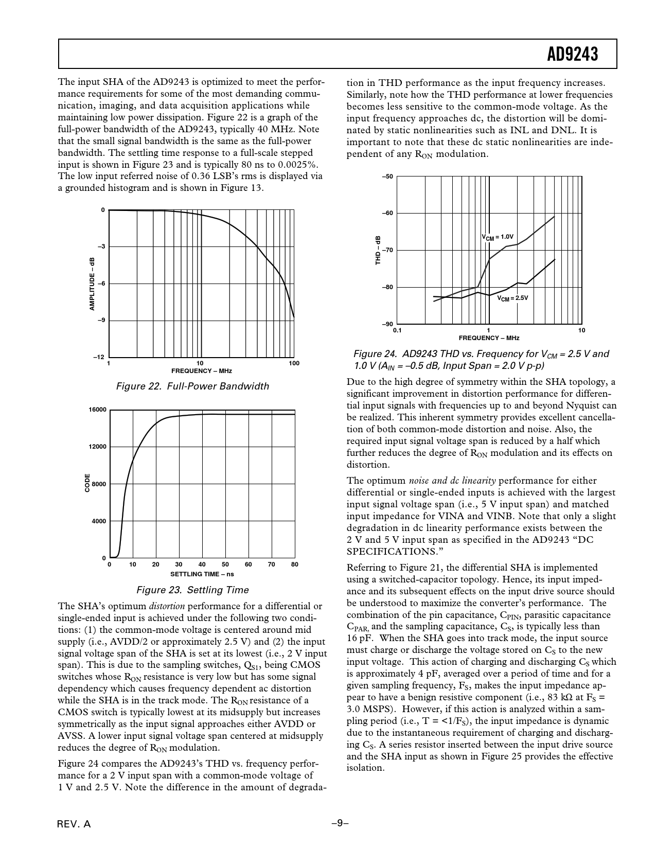 AD9243 The input SHA of the AD9243 is optimized to meet the perfor- tion in THD performance as the input frequency increases. mance requirements for some of the most demanding commu- Similarly, note how the THD performance at lower frequencies nication, imaging, and data acquisition applications while becomes less sensitive to the common-mode voltage. As the maintaining low power dissipation. Figure 22 is a graph of the input frequency approaches dc, the distortion will be domi- full-power bandwidth of the AD9243, typically 40 MHz. Note nated by static nonlinearities such as INL and DNL. It is that the small signal bandwidth is the same as the full-power important to note that these dc static nonlinearities are inde- bandwidth. The settling time response to a full-scale stepped pendent of any RON modulation. input is shown in Figure 23 and is typically 80 ns to 0.0025%. The low input referred noise of 0.36 LSB’s rms is displayed via –50 a grounded histogram and is shown in Figure 13. 0–60VCM = 1.0V–3–70THD – dB–6–80VCM = 2.5VAMPLITUDE – dB–9–900.1110FREQUENCY – MHz–12 Figure 24. AD9243 THD vs. Frequency for VCM = 2.5 V and 110100 1.0 V (A FREQUENCY – MHz IN = –0.5 dB, Input Span = 2.0 V p-p) Figure 22. Full-Power Bandwidth Due to the high degree of symmetry within the SHA topology, a significant improvement in distortion performance for differen- tial input signals with frequencies up to and beyond Nyquist can 16000 be realized. This inherent symmetry provides excellent cancella- tion of both common-mode distortion and noise. Also, the required input signal voltage span is reduced by a half which 12000 further reduces the degree of RON modulation and its effects on distortion. The optimum noise and dc linearity performance for either 8000CODE differential or single-ended inputs is achieved with the largest input signal voltage span (i.e., 5 V input span) and matched input impedance for VINA and VINB. Note that only a slight 4000 degradation in dc linearity performance exists between the 2 V and 5 V input span as specified in the AD9243 “DC SPECIFICATIONS.” 001020304050607080 Referring to Figure 21, the differential SHA is implemented SETTLING TIME – ns using a switched-capacitor topology. Hence, its input imped- Figure 23. Settling Time ance and its subsequent effects on the input drive source should The SHA’s optimum distortion performance for a differential or be understood to maximize the converter’s performance. The single-ended input is achieved under the following two condi- combination of the pin capacitance, CPIN, parasitic capacitance tions: (1) the common-mode voltage is centered around mid CPAR, and the sampling capacitance, CS, is typically less than supply (i.e., AVDD/2 or approximately 2.5 V) and (2) the input 16 pF. When the SHA goes into track mode, the input source signal voltage span of the SHA is set at its lowest (i.e., 2 V input must charge or discharge the voltage stored on CS to the new span). This is due to the sampling switches, Q input voltage. This action of charging and discharging CS which S1, being CMOS switches whose R is approximately 4 pF, averaged over a period of time and for a ON resistance is very low but has some signal dependency which causes frequency dependent ac distortion given sampling frequency, FS, makes the input impedance ap- while the SHA is in the track mode. The R pear to have a benign resistive component (i.e., 83 kΩ at FS = ON resistance of a CMOS switch is typically lowest at its midsupply but increases 3.0 MSPS). However, if this action is analyzed within a sam- symmetrically as the input signal approaches either AVDD or pling period (i.e., T = <1/FS), the input impedance is dynamic AVSS. A lower input signal voltage span centered at midsupply due to the instantaneous requirement of charging and discharg- reduces the degree of R ing CS. A series resistor inserted between the input drive source ON modulation. and the SHA input as shown in Figure 25 provides the effective Figure 24 compares the AD9243’s THD vs. frequency perfor- isolation. mance for a 2 V input span with a common-mode voltage of 1 V and 2.5 V. Note the difference in the amount of degrada- REV. A –9–