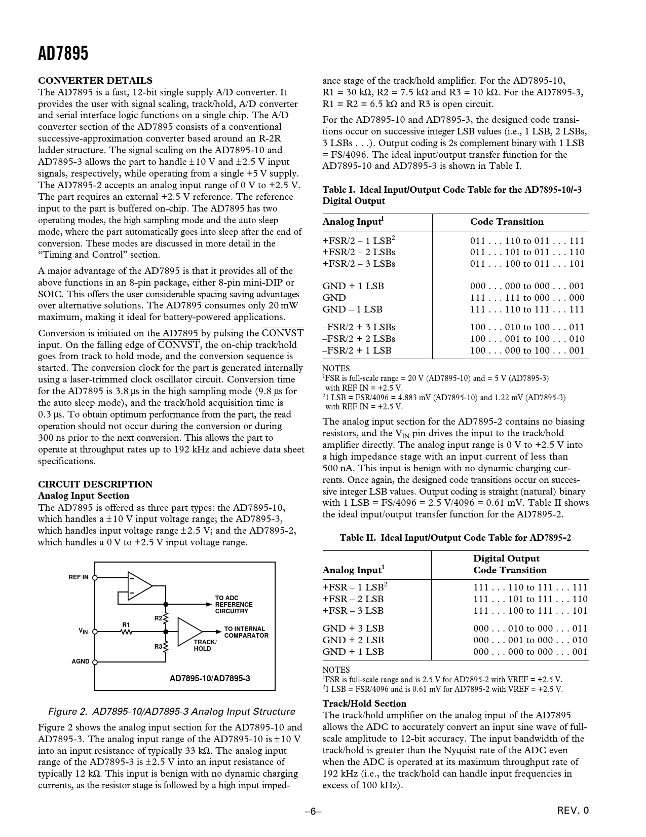 with 1 LSB = FS/4096 = 2.5 V/4096 = 0.61 mV. Table II shows The AD7895 is offered as three part types: the AD7895-10, the ideal input/output transfer function for the AD7895-2. which handles a ± 10 V input voltage range; the AD7895-3, which handles input voltage range ± 2.5 V; and the AD7895-2, which handles a 0 V to +2.5 V input voltage range.