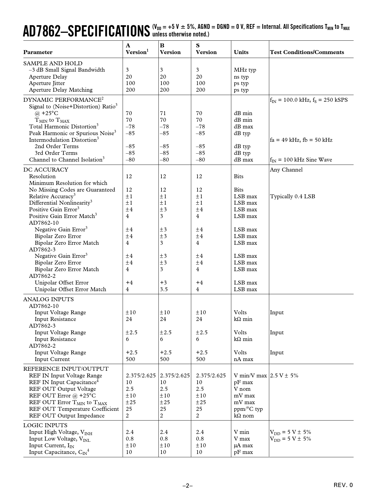 AD7862–SPECIFICATIONS (VDD = +5 V. 5%, AGND = DGND = 0 V, REF = Internal. All Specifications TMIN to TMAX