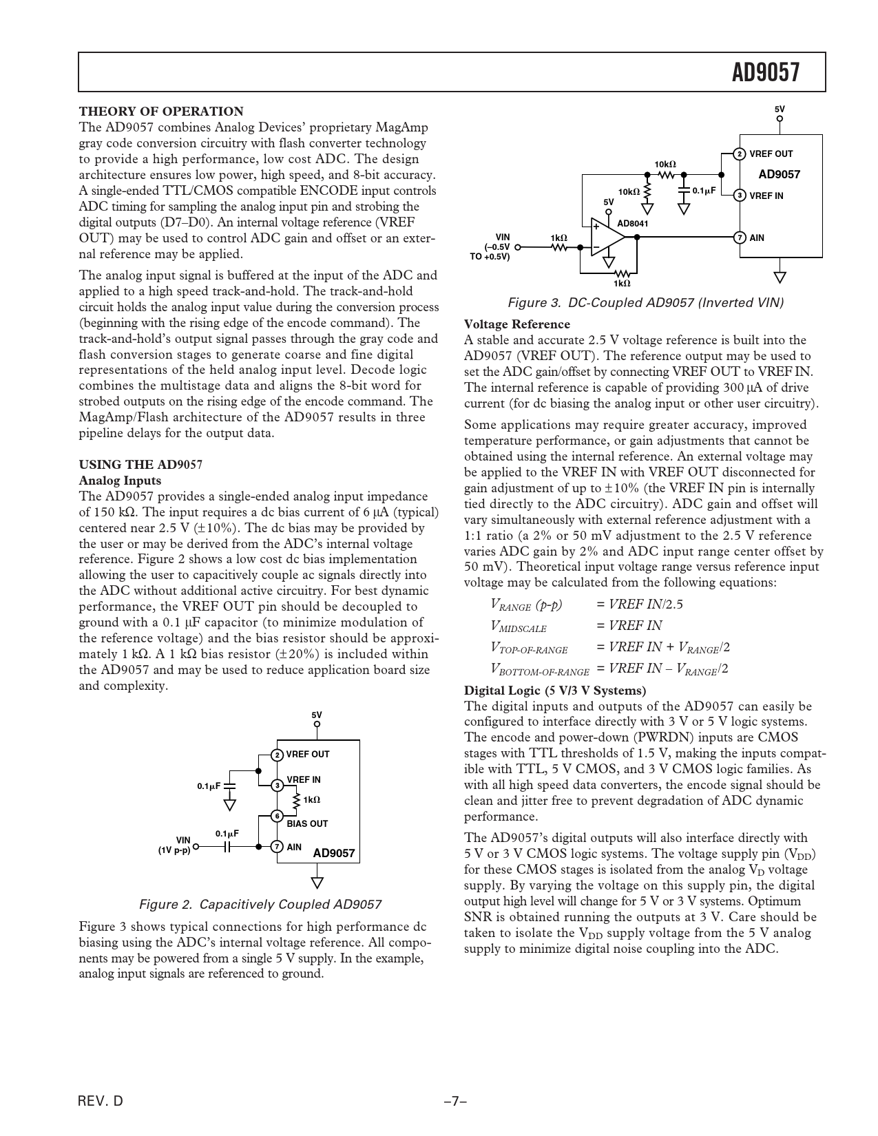 AD9057THEORY OF OPERATION5V The AD9057 combines Analog Devices’ proprietary MagAmp gray code conversion circuitry with flash converter technology to provide a high performance, low cost ADC. The design VREF OUT10k ⍀ architecture ensures low power, high speed, and 8-bit accuracy. AD9057 A single-ended TTL/CMOS compatible ENCODE input controls 0.110k ⍀ FVREF IN ADC timing for sampling the analog input pin and strobing the 5V digital outputs (D7–D0). An internal voltage reference (VREF AD8041 OUT) may be used to control ADC gain and offset or an exter- VIN1k ⍀ AIN(–0.5V nal reference may be applied. TO +0.5V) The analog input signal is buffered at the input of the ADC and 1k ⍀ applied to a high speed track-and-hold. The track-and-hold circuit holds the analog input value during the conversion process Figure 3. DC-Coupled AD9057 (Inverted VIN) (beginning with the rising edge of the encode command). The Voltage Reference track-and-hold’s output signal passes through the gray code and A stable and accurate 2.5 V voltage reference is built into the flash conversion stages to generate coarse and fine digital AD9057 (VREF OUT). The reference output may be used to representations of the held analog input level. Decode logic set the ADC gain/offset by connecting VREF OUT to VREF IN. combines the multistage data and aligns the 8-bit word for The internal reference is capable of providing 300 mA of drive strobed outputs on the rising edge of the encode command. The current (for dc biasing the analog input or other user circuitry). MagAmp/Flash architecture of the AD9057 results in three Some applications may require greater accuracy, improved pipeline delays for the output data. temperature performance, or gain adjustments that cannot be obtained using the internal reference. An external voltage may USING THE AD9057 be applied to the VREF IN with VREF OUT disconnected for Analog Inputs gain adjustment of up to ± 10% (the VREF IN pin is internally The AD9057 provides a single-ended analog input impedance tied directly to the ADC circuitry). ADC gain and offset will of 150 kW. The input requires a dc bias current of 6 mA (typical) vary simultaneously with external reference adjustment with a centered near 2.5 V (±10%). The dc bias may be provided by 1:1 ratio (a 2% or 50 mV adjustment to the 2.5 V reference the user or may be derived from the ADC’s internal voltage varies ADC gain by 2% and ADC input range center offset by reference. Figure 2 shows a low cost dc bias implementation 50 mV). Theoretical input voltage range versus reference input allowing the user to capacitively couple ac signals directly into voltage may be calculated from the following equations: the ADC without additional active circuitry. For best dynamic performance, the VREF OUT pin should be decoupled to VRANGE (p-p) = VREF IN/2.5 ground with a 0.1 mF capacitor (to minimize modulation of VMIDSCALE = VREF IN the reference voltage) and the bias resistor should be approxi- V mately 1 kW. A 1 kW bias resistor (± 20%) is included within TOP-OF-RANGE = VREF IN + VRANGE/2 the AD9057 and may be used to reduce application board size VBOTTOM-OF-RANGE = VREF IN – VRANGE /2 and complexity. Digital Logic (5 V/3 V Systems) The digital inputs and outputs of the AD9057 can easily be 5V configured to interface directly with 3 V or 5 V logic systems. The encode and power-down (PWRDN) inputs are CMOS VREF OUT stages with TTL thresholds of 1.5 V, making the inputs compat- ible with TTL, 5 V CMOS, and 3 V CMOS logic families. As VREF IN0.1 F with all high speed data converters, the encode signal should be 1k ⍀ clean and jitter free to prevent degradation of ADC dynamic performance. BIAS OUT0.1 FVIN The AD9057’s digital outputs will also interface directly with AIN(1V p-p)AD9057 5 V or 3 V CMOS logic systems. The voltage supply pin (VDD) for these CMOS stages is isolated from the analog VD voltage supply. By varying the voltage on this supply pin, the digital Figure 2. Capacitively Coupled AD9057 output high level will change for 5 V or 3 V systems. Optimum SNR is obtained running the outputs at 3 V. Care should be Figure 3 shows typical connections for high performance dc taken to isolate the VDD supply voltage from the 5 V analog biasing using the ADC’s internal voltage reference. All compo- supply to minimize digital noise coupling into the ADC. nents may be powered from a single 5 V supply. In the example, analog input signals are referenced to ground. REV. D –7– Document Outline FEATURES APPLICATIONS PRODUCT DESCRIPTION FUNCTIONAL BLOCK DIAGRAM SPECIFICATIONS ABSOLUTE MAXIMUM RATINGS ORDERING GUIDE PIN CONFIGURATION PIN FUNCTION DESCRIPTIONS Typical Performance Characteristics THEORY OF OPERATION USING THE AD9057 Analog Inputs Voltage Reference Digital Logic (5 V/3 V Systems) Timing Power Dissipation APPLICATIONS Evaluation Board OUTLINE DIMENSIONS Revision History