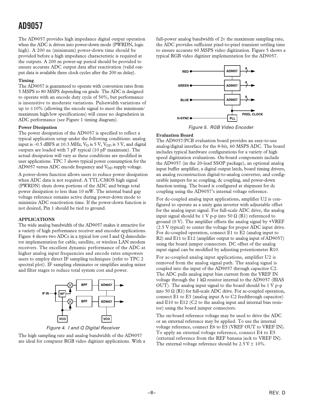 or an external reference may be applied. To use the internal Figure 4. I and Q Digital Receiver voltage reference, connect E6 to E5 (VREF OUT to VREF IN). To apply an external voltage reference, connect E4 to E5 The high sampling rate and analog bandwidth of the AD9057 (external reference from the REF banana jack to VREF IN). are ideal for computer RGB video digitizer applications. With a The external voltage reference should be 2.5 V ± 10%. –8– REV. D Document Outline FEATURES APPLICATIONS PRODUCT DESCRIPTION FUNCTIONAL BLOCK DIAGRAM SPECIFICATIONS ABSOLUTE MAXIMUM RATINGS ORDERING GUIDE PIN CONFIGURATION PIN FUNCTION DESCRIPTIONS Typical Performance Characteristics THEORY OF OPERATION USING THE AD9057 Analog Inputs Voltage Reference Digital Logic (5 V/3 V Systems) Timing Power Dissipation APPLICATIONS Evaluation Board OUTLINE DIMENSIONS Revision History
