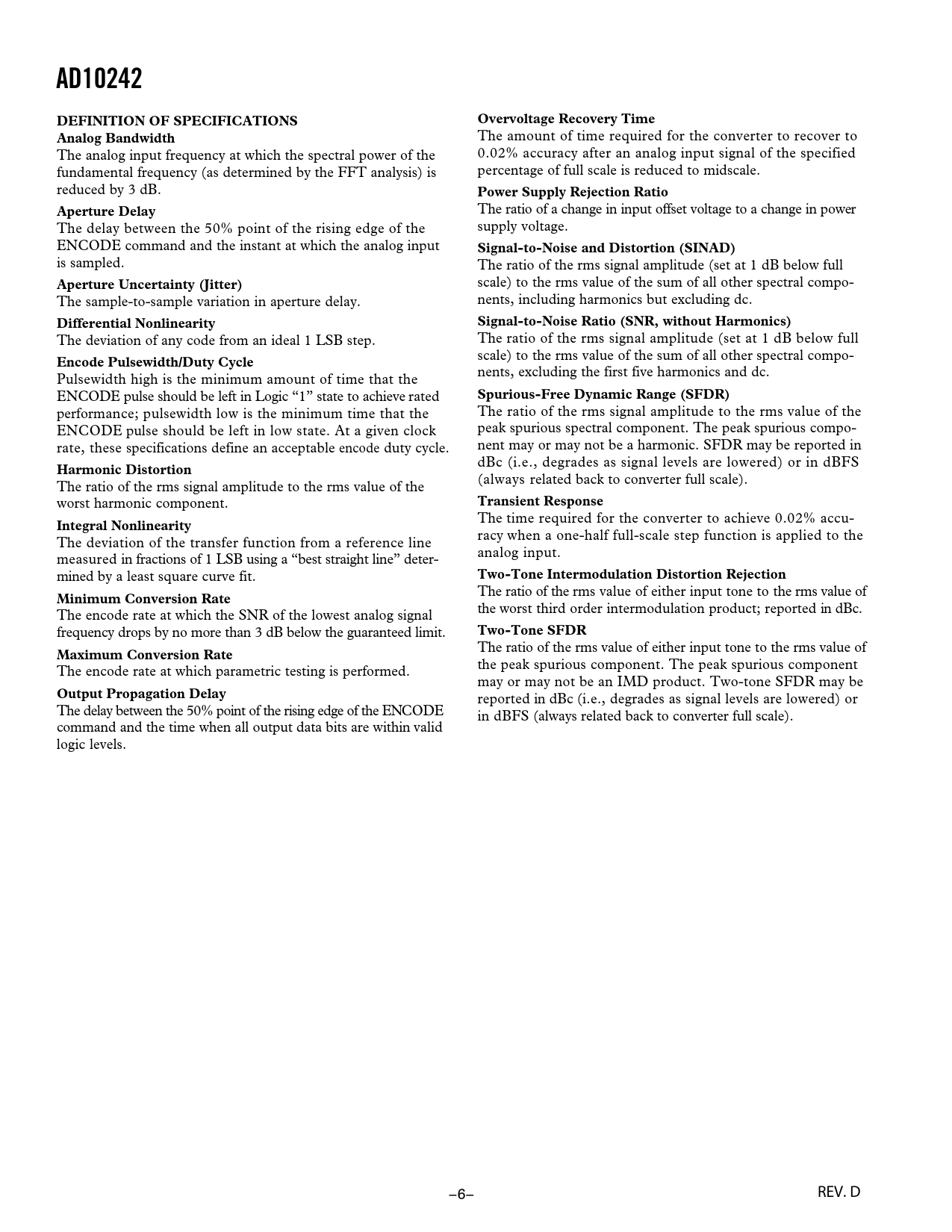 AD10242 DEFINITION OF SPECIFICATIONS Overvoltage Recovery Time Analog Bandwidth Power Supply Rejection Ratio Aperture Delay