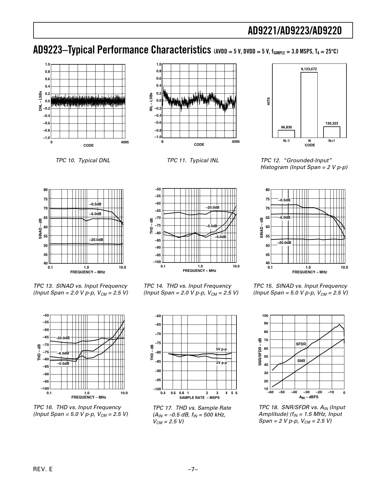 AD9221/AD9223/AD9220AD9223–Typical Performance Characteristics (AVDD = 5 V, DVDD = 5 V, fSAMPLE = 3.0 MSPS, TA = 25C)1.01.08,123,6720.80.80.60.60.40.40.20.20.00.0HITS–0.2DNL – LSBs–0.2INL – LSBs–0.4–0.4–0.6–0.6130,32396,830–0.8–0.8–1.0–1.00409504095N–1NN+1CODECODECODE TPC 10. Typical DNL TPC 11. Typical INL TPC 12. “Grounded-Input” Histogram (Input Span = 2 V p-p) 80–5080–557575–0.5dB–0.5dB–6070–20.0dB70–65–6.0dB65–7065–6.0dB–7560–0.5dB60THD – dB –80SINAD – dB 55–6.0dBSINAD – dB 55–20.0dB–85–20.0dB5050–9045–954540–100400.11.010.00.11.010.00.11.010.0FREQUENCY – MHzFREQUENCY – MHzFREQUENCY – MHz TPC 13. SINAD vs. Input Frequency TPC 14. THD vs. Input Frequency TPC 15. SINAD vs. Input Frequency (Input Span = 2.0 V p-p, VCM = 2.5 V) (Input Span = 2.0 V p-p, VCM = 2.5 V) (Input Span = 5.0 V p-p, VCM = 2.5 V) –50–60100–55–6590–6080–70–65–20.0dB70–75–70SFDR5V p-p60–75–6.0dB–8050THD – dB –80THD – dB –85SNR–0.5dB2V p-pSNR/SFDR – dB 40–85–90–9030–95–9520–100–100100.11.010.00.40.60.8 12345 6–60–50–40–30–20–100FREQUENCY – MHzSAMPLE RATE – MSPSAIN – dBFS TPC 16. THD vs. Input Frequency TPC 17. THD vs. Sample Rate TPC 18. SNR/SFDR vs. AIN (Input (Input Span = 5.0 V p-p, VCM = 2.5 V) (A Amplitude) (f IN = –0.5 dB, fIN = 500 kHz, IN = 1.5 MHz, Input V Span = 2 V p-p, V CM = 2.5 V) CM = 2.5 V) REV. E –7– Document Outline FEATURES GENERAL DESCRIPTION FUNCTIONAL BLOCK DIAGRAM PRODUCT HIGHLIGHTS SPECIFICATIONS DC SPECIFICATIONS AC SPECIFICATIONS DIGITAL SPECIFICATIONS SWITCHING SPECIFICATIONS ABSOLUTE MAXIMUM RATINGS THERMAL CHARACTERISTICS ORDERING GUIDE PIN CONFIGURATION PIN FUNCTION DESCRIPTIONS DEFINITIONS OF SPECIFICATIONS Integral Nonlinearity (INL) Differential Nonlinearity (DNL, No Missing Codes) Zero Error Gain Error Temperature Drift Power Supply Rejection Aperture Jitter Aperture Delay Signal-to-Noise and Distortion (S/N+D, SINAD) Ratio Effective Number of Bits (ENOB) Total Harmonic Distortion (THD) Signal-to-Noise Ratio (SNR) Spurious Free Dynamic Range (SFDR) Typical Performance Characteristics INTRODUCTION ANALOG INPUT AND REFERENCE OVERVIEW ANALOG INPUT OPERATION REFERENCE OPERATION DRIVING THE ANALOG INPUTS Introduction SINGLE-ENDED MODE OF OPERATION DC COUPLING AND INTERFACE ISSUES Simple Op Amp Buffer Op Amp with DC Level Shifting AC COUPLING AND INTERFACE ISSUES Simple AC Interface Alternative AC Interface Op Amp Selection Guide DIFFERENTIAL MODE OF OPERATION REFERENCE CONFIGURATIONS USING THE INTERNAL REFERENCE Single-Ended Input with 0 to 2 VREF Range Single-Ended or Differential Input, VCM = 2.5 V VINA Resistor Programmable Reference USING AN EXTERNAL REFERENCE Variable Input Span with VCM = 2.5 V Single-Ended Input with 0 to 2 VREF Range Low Cost/Power Reference DIGITAL INPUTS AND OUTPUTS Digital Outputs Out Of Range (OTR) Digital Output Driver Considerations (DVDD) Clock Input and Considerations GROUNDING AND DECOUPLING Analog and Digital Grounding Analog and Digital Supply Decoupling APPLICATIONS Direct IF Down Conversion Using the AD9220 Multichannel Data Acquisition with Autocalibration OUTLINE DIMENSIONS Revision History