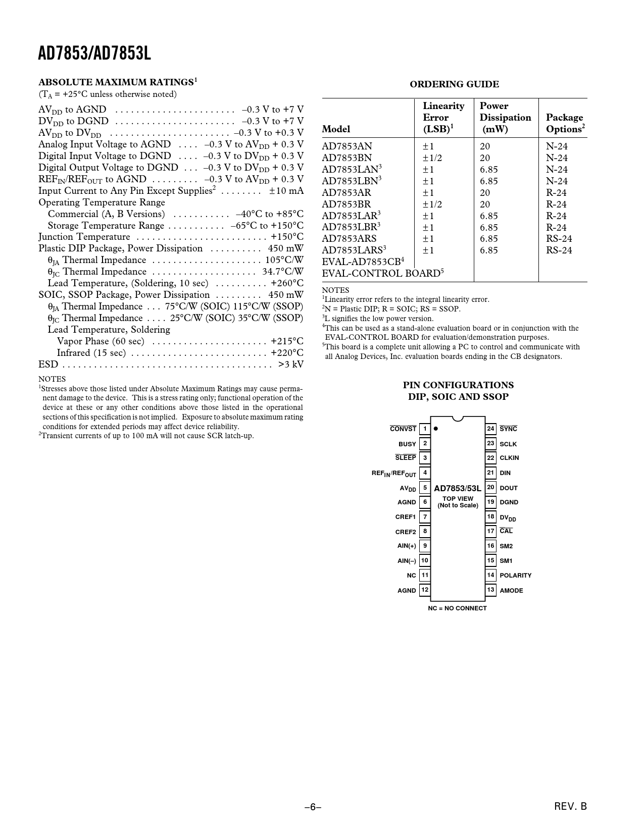 DD to DVDD . –0.3 V to +0.3 V Analog Input Voltage to AGND . –0.3 V to AVDD + 0.3 V AD7853AN ±1 20 N-24 Digital Input Voltage to DGND . –0.3 V to DVDD + 0.3 V AD7853BN ±1/2 20 N-24 Digital Output Voltage to DGND . –0.3 V to DVDD + 0.3 V AD7853LAN3 ±1 6.85 N-24 REFIN/REFOUT to AGND . –0.3 V to AVDD + 0.3 V AD7853LBN3 ±1 6.85 N-24 Input Current to Any Pin Except Supplies2 . ± 10 mA AD7853AR ±1 20 R-24 Operating Temperature Range AD7853BR ±1/2 20 R-24 Commercial (A, B Versions) . –40°C to +85°C AD7853LAR3 ±1 6.85 R-24 Storage Temperature Range . –65°C to +150°C AD7853LBR3 ±1 6.85 R-24 Junction Temperature . +150°C AD7853ARS ±1 6.85 RS-24 Plastic DIP Package, Power Dissipation . 450 mW AD7853LARS3 ±1 6.85 RS-24 θJA Thermal Impedance . 105°C/W EVAL-AD7853CB4 θJC Thermal Impedance . 34.7°C/W EVAL-CONTROL BOARD5 Lead Temperature, (Soldering, 10 sec) . +260°C NOTES SOIC, SSOP Package, Power Dissipation . 450 mW 1 θ Linearity error refers to the integral linearity error. JA Thermal Impedance . 75°C/W (SOIC) 115°C/W (SSOP) 2N = Plastic DIP; R = SOIC; RS = SSOP. θ 3 JC Thermal Impedance . 25°C/W (SOIC) 35°C/W (SSOP) L signifies the low power version. Lead Temperature, Soldering 4This can be used as a stand-alone evaluation board or in conjunction with the Vapor Phase (60 sec) . +215°C EVAL-CONTROL BOARD for evaluation/demonstration purposes. 5This board is a complete unit allowing a PC to control and communicate with Infrared (15 sec) . +220°C all Analog Devices, Inc. evaluation boards ending in the CB designators. ESD . >3 kV NOTES 1Stresses above those listed under Absolute Maximum Ratings may cause perma-