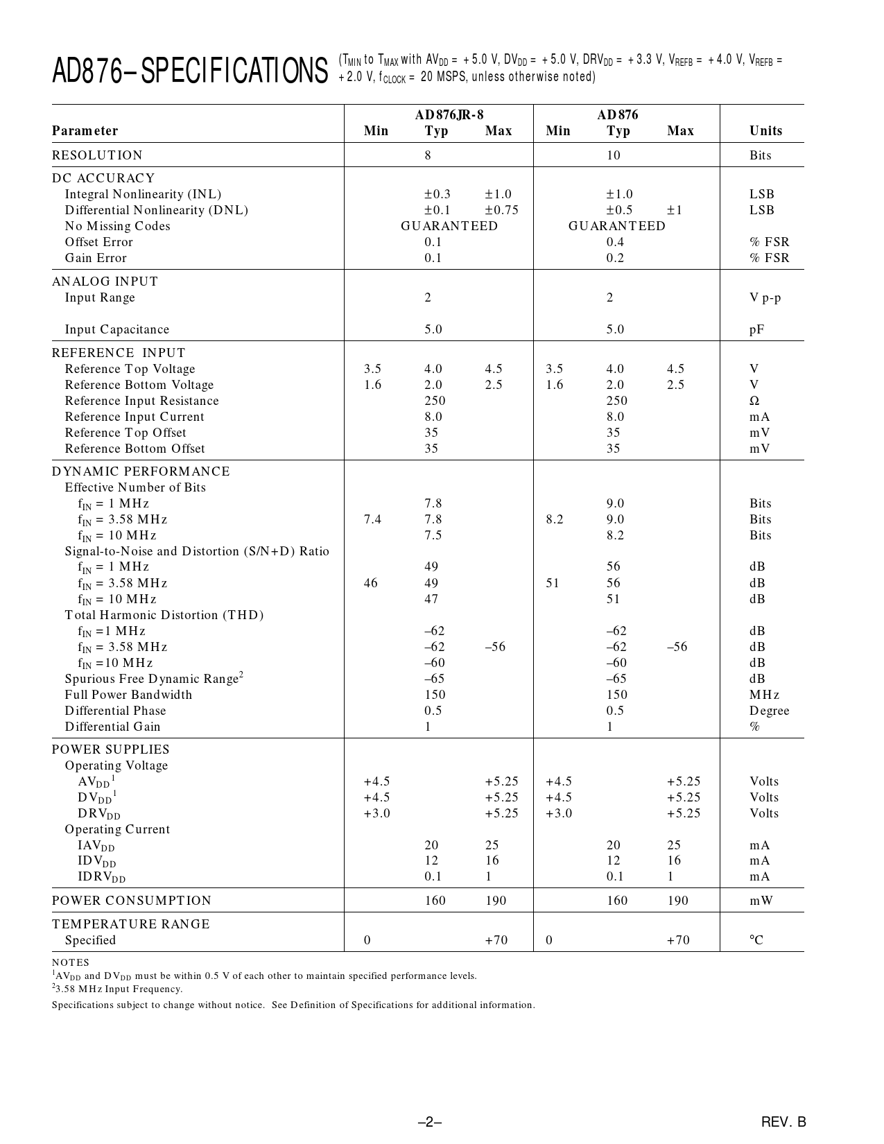 AD876–SPECIFICATIONS (TMIN to TMAX with AVDD = +5.0 V, DVDD = +5.0 V, DRVDD = +3.3 V, VREFB = +4.0 V, VREFB = +2.0 V, fCLOCK = 20 MSPS, unless otherwise noted) AD876JR-8 AD876 Parameter Min Typ Max Min Typ Max Units