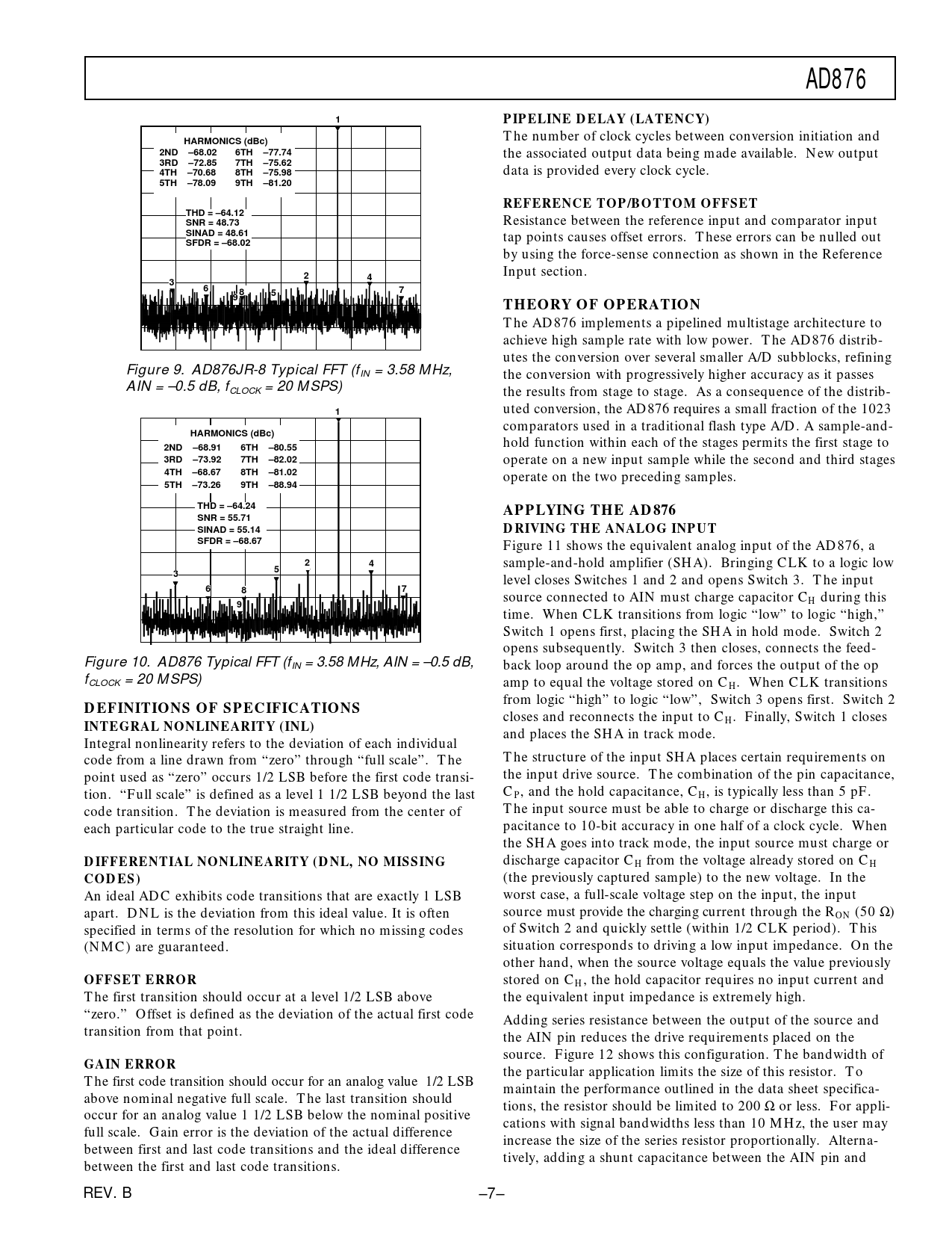 AD876 PIPELINE DELAY (LATENCY) HARMONICS (dBc) 2ND –68.02 6TH –77.74 3RD –72.85 7TH –75.62 4TH –70.68 8TH –75.98 5TH –78.09