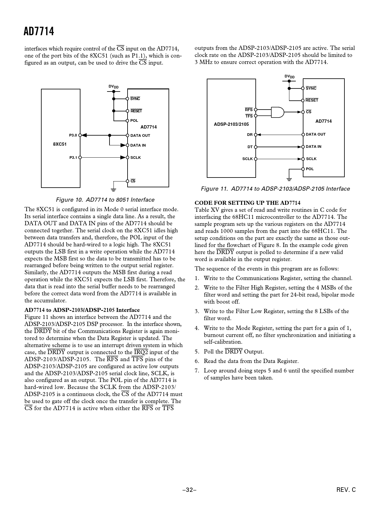 AD7714 interfaces which require control of the CS input on the AD7714, outputs from the ADSP-2103/ADSP-2105 are active. The serial one of the port bits of the 8XC51 (such as P1.1), which is con- clock rate on the ADSP-2103/ADSP-2105 should be limited to figured as an output, can be used to drive the CS input. 3␣ MHz to ensure correct operation with the AD7714. DVDDDVDDSYNCSYNCRESETRESETRFSCSTFSPOLAD7714ADSP-2103/2105AD7714P3.0DATA OUTDRDATA OUT8XC51DATA INDTDATA INP3.1SCLKSCLKSCLKPOLCS Figure 11. AD7714 to ADSP-2103/ADSP-2105 Interface Figure 10. AD7714 to 8051 Interface CODE FOR SETTING UP THE AD7714 The 8XC51 is configured in its Mode 0 serial interface mode. Table XV gives a set of read and write routines in C code for Its serial interface contains a single data line. As a result, the interfacing the 68HC11 microcontroller to the AD7714. The DATA OUT and DATA IN pins of the AD7714 should be sample program sets up the various registers on the AD7714 connected together. The serial clock on the 8XC51 idles high and reads 1000 samples from the part into the 68HC11. The between data transfers and, therefore, the POL input of the setup conditions on the part are exactly the same as those out- AD7714 should be hard-wired to a logic high. The 8XC51 lined for the flowchart of Figure 8. In the example code given outputs the LSB first in a write operation while the AD7714 here the DRDY output is polled to determine if a new valid expects the MSB first so the data to be transmitted has to be word is available in the output register. rearranged before being written to the output serial register. The sequence of the events in this program are as follows: Similarly, the AD7714 outputs the MSB first during a read operation while the 8XC51 expects the LSB first. Therefore, the 1. Write to the Communications Register, setting the channel. data that is read into the serial buffer needs to be rearranged 2. Write to the Filter High Register, setting the 4 MSBs of the before the correct data word from the AD7714 is available in filter word and setting the part for 24-bit read, bipolar mode the accumulator. with boost off. AD7714 to ADSP-2103/ADSP-2105 Interface 3. Write to the Filter Low Register, setting the 8 LSBs of the Figure 11 shows an interface between the AD7714 and the filter word. ADSP-2103/ADSP-2105 DSP processor. In the interface shown, 4. Write to the Mode Register, setting the part for a gain of 1, the DRDY bit of the Communications Register is again moni- burnout current off, no filter synchronization and initiating a tored to determine when the Data Register is updated. The self-calibration. alternative scheme is to use an interrupt driven system in which case, the DRDY output is connected to the IRQ2 input of the 5. Poll the DRDY Output. ADSP-2103/ADSP-2105. The RFS and TFS pins of the 6. Read the data from the Data Register. ADSP-2103/ADSP-2105 are configured as active low outputs and the ADSP-2103/ADSP-2105 serial clock line, SCLK, is 7. Loop around doing steps 5 and 6 until the specified number also configured as an output. The POL pin of the AD7714 is of samples have been taken. hard-wired low. Because the SCLK from the ADSP-2103/ ADSP-2105 is a continuous clock, the CS of the AD7714 must be used to gate off the clock once the transfer is complete. The CS for the AD7714 is active when either the RFS or TFS –32– REV. C