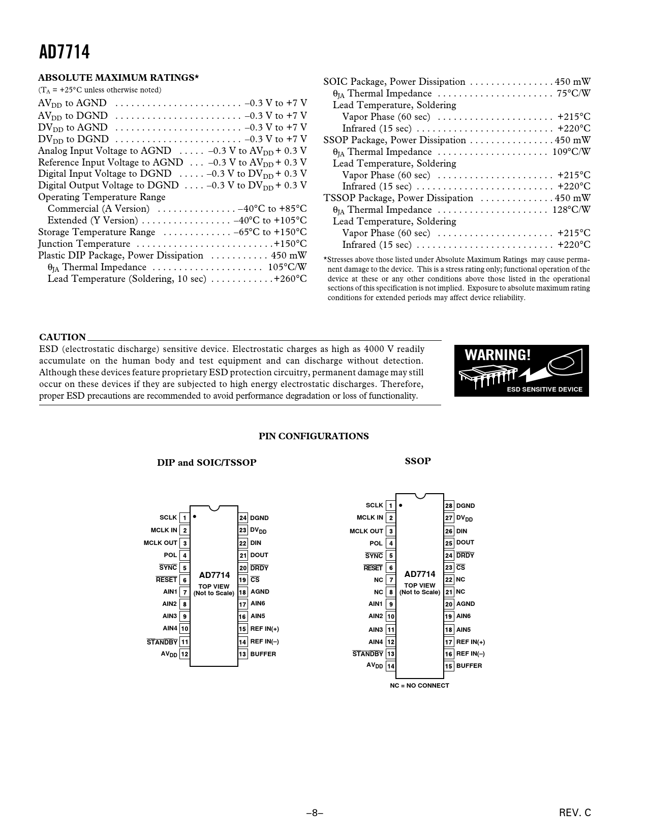 AD7714. ABSOLUTE MAXIMUM RATINGS*. CAUTION. WARNING!. ESD SENSITIVE DEVICE. PIN CONFIGURATIONS. DIP and SOIC/TSSOP. SSOP. SCLK. DGND
