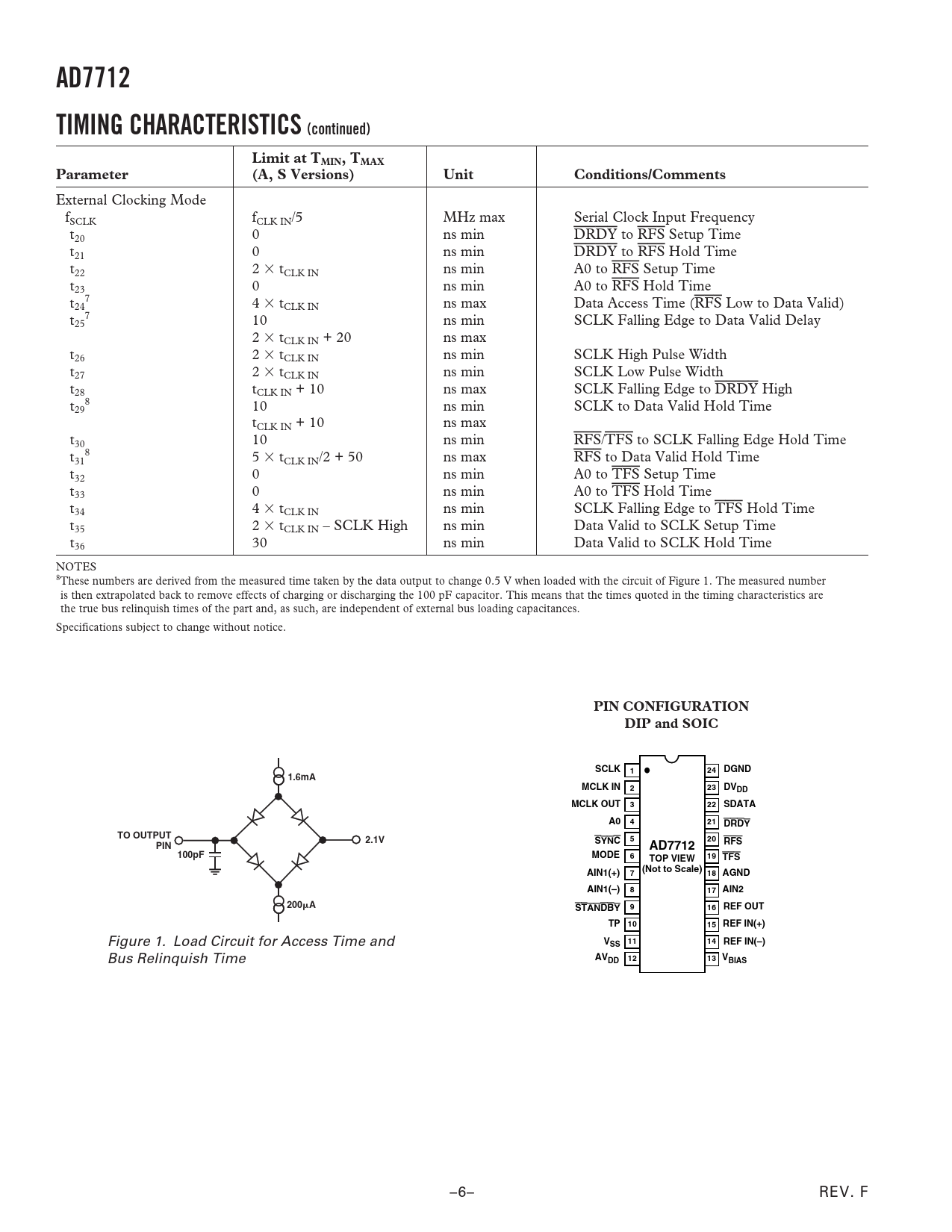 PIN CONFIGURATION DIP and SOIC SCLK 1 24 DGND 1.6mA MCLK IN 2 23 DVDD MCLK OUT 3 22 SDATA A0 4 21 DRDY TO OUTPUT 2.1V 5 20 SYNC RFS PIN AD7712 100pF MODE 6 TOP VIEW 19 TFS (Not to Scale) AIN1(+) 7 18 AGND AIN1(–) 8 17 AIN2 200