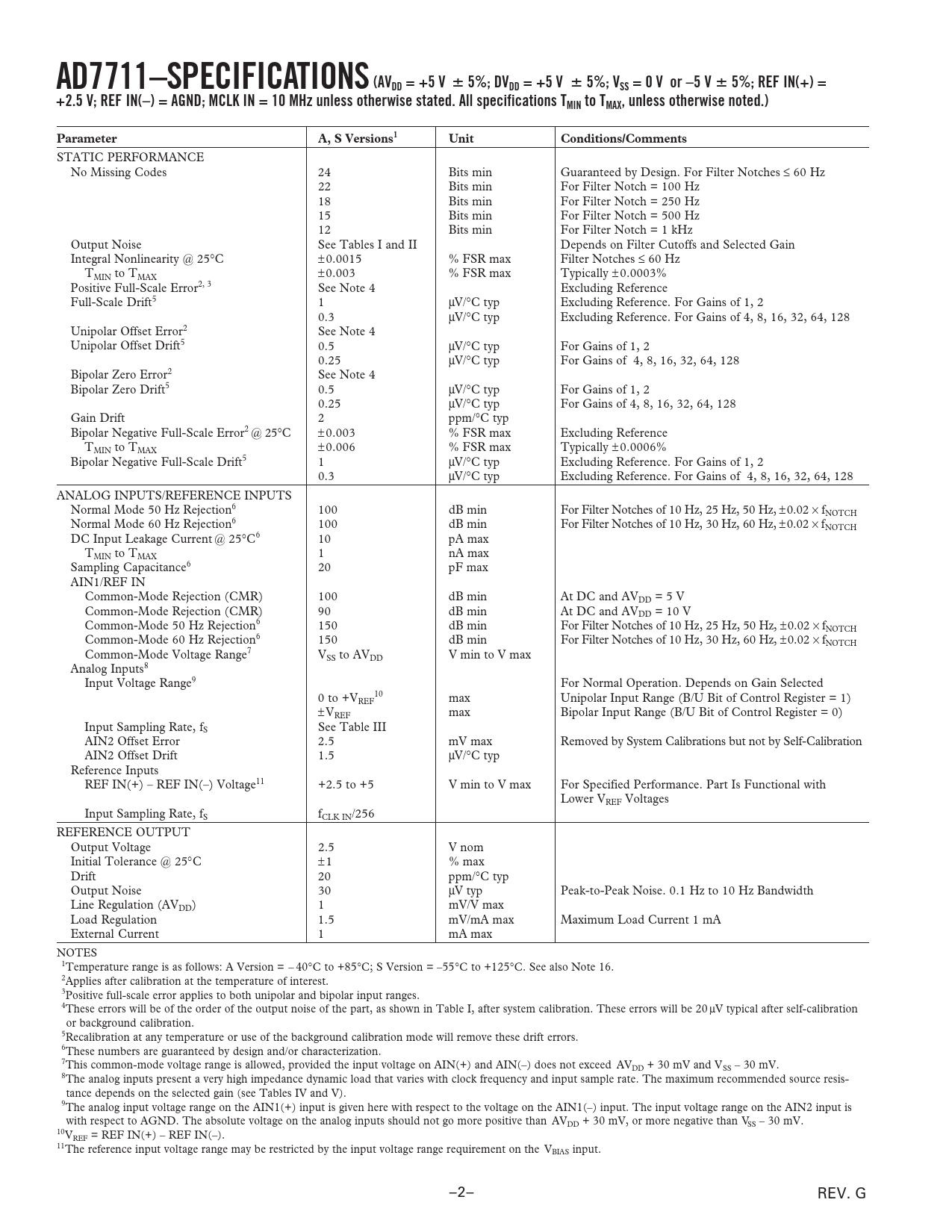 AD7711–SPECIFICATIONS(AVDD = +5 V ⴞ 5%; DVDD = +5 V ⴞ 5%; VSS = 0 V or –5 V ⴞ 5%; REF IN(+) =+2.5 V; REF IN(–) = AGND; MCLK IN = 10 MHz unless otherwise stated. All specifications TMIN to TMAX, unless otherwise noted.)ParameterA, S Versions1UnitConditions/Comments STATIC PERFORMANCE No Missing Codes 24 Bits min Guaranteed by Design. For Filter Notches £ 60 Hz 22 Bits min For Filter Notch = 100 Hz 18 Bits min For Filter Notch = 250 Hz 15 Bits min For Filter Notch = 500 Hz 12 Bits min For Filter Notch = 1 kHz Output Noise See Tables I and II Depends on Filter Cutoffs and Selected Gain Integral Nonlinearity @ 25∞C ±0.0015 % FSR max Filter Notches £ 60 Hz T ± MIN to TMAX 0.003 % FSR max Typically ± 0.0003% Positive Full-Scale Error2, 3 See Note 4 Excluding Reference Full-Scale Drift5 1 mV/∞C typ Excluding Reference. For Gains of 1, 2 0.3 mV/∞C typ Excluding Reference. For Gains of 4, 8, 16, 32, 64, 128 Unipolar Offset Error2 See Note 4 Unipolar Offset Drift5 0.5 mV/∞C typ For Gains of 1, 2 0.25 mV/∞C typ For Gains of 4, 8, 16, 32, 64, 128 Bipolar Zero Error2 See Note 4 Bipolar Zero Drift5 0.5 mV/∞C typ For Gains of 1, 2 0.25 mV/∞C typ For Gains of 4, 8, 16, 32, 64, 128 Gain Drift 2 ppm/∞C typ Bipolar Negative Full-Scale Error2 @ 25∞C ±0.003 % FSR max Excluding Reference T ± MIN to TMAX 0.006 % FSR max Typically ± 0.0006% Bipolar Negative Full-Scale Drift5 1 mV/∞C typ Excluding Reference. For Gains of 1, 2 0.3 mV/∞C typ Excluding Reference. For Gains of 4, 8, 16, 32, 64, 128 ANALOG INPUTS/REFERENCE INPUTS Normal Mode 50 Hz Rejection6 100 dB min For Filter Notches of 10 Hz, 25 Hz, 50 Hz, ±0.02 ¥ fNOTCH Normal Mode 60 Hz Rejection6 100 dB min For Filter Notches of 10 Hz, 30 Hz, 60 Hz, ±0.02 ¥ fNOTCH DC Input Leakage Current @ 25∞C6 10 pA max TMIN to TMAX 1 nA max Sampling Capacitance6 20 pF max AIN1/REF IN Common-Mode Rejection (CMR) 100 dB min At DC and AVDD = 5 V Common-Mode Rejection (CMR) 90 dB min At DC and AVDD = 10 V Common-Mode 50 Hz Rejection6 150 dB min For Filter Notches of 10 Hz, 25 Hz, 50 Hz, ±0.02 ¥ fNOTCH Common-Mode 60 Hz Rejection6 150 dB min For Filter Notches of 10 Hz, 30 Hz, 60 Hz, ±0.02 ¥ fNOTCH Common-Mode Voltage Range7 VSS to AVDD V min to V max Analog Inputs8 Input Voltage Range9 For Normal Operation. Depends on Gain Selected 0 to +V 10 REF max Unipolar Input Range (B/U Bit of Control Register = 1) ±VREF max Bipolar Input Range (B/U Bit of Control Register = 0) Input Sampling Rate, fS See Table III AIN2 Offset Error 2.5 mV max Removed by System Calibrations but not by Self-Calibration AIN2 Offset Drift 1.5 mV/∞C typ Reference Inputs REF IN(+) – REF IN(–) Voltage11 +2.5 to +5 V min to V max For Specified Performance. Part Is Functional with Lower VREF Voltages Input Sampling Rate, fS fCLK IN/256 REFERENCE OUTPUT Output Voltage 2.5 V nom Initial Tolerance @ 25∞C ±1 % max Drift 20 ppm/∞C typ Output Noise 30 mV typ Peak-to-Peak Noise. 0.1 Hz to 10 Hz Bandwidth Line Regulation (AVDD) 1 mV/V max Load Regulation 1.5 mV/mA max Maximum Load Current 1 mA External Current 1 mA max NOTES 1Temperature range is as follows: A Version = – 40∞C to +85∞C; S Version = –55∞C to +125∞C. See also Note 16. 2Applies after calibration at the temperature of interest. 3Positive full-scale error applies to both unipolar and bipolar input ranges. 4These errors will be of the order of the output noise of the part, as shown in Table I, after system calibration. These errors will be 20 mV typical after self-calibration or background calibration. 5Recalibration at any temperature or use of the background calibration mode will remove these drift errors. 6These numbers are guaranteed by design and/or characterization. 7This common-mode voltage range is allowed, provided the input voltage on AIN(+) and AIN(–) does not exceed AVDD + 30 mV and VSS – 30 mV. 8The analog inputs present a very high impedance dynamic load that varies with clock frequency and input sample rate. The maximum recommended source resis- tance depends on the selected gain (see Tables IV and V). 9The analog input voltage range on the AIN1(+) input is given here with respect to the voltage on the AIN1(–) input. The input voltage range on the AIN2 input is with respect to AGND. The absolute voltage on the analog inputs should not go more positive than AVDD + 30 mV, or more negative than VSS – 30 mV. 10VREF = REF IN(+) – REF IN(–). 11The reference input voltage range may be restricted by the input voltage range requirement on the VBIAS input. –2– REV. G Document Outline FEATURES APPLICATIONS GENERAL DESCRIPTION FUNCTIONAL BLOCK DIAGRAM PRODUCT HIGHLIGHTS SPECIFICATIONS TIMING CHARACTERISTICS PIN FUNCTION DESCRIPTIONS TERMINOLOGY Intergral Nonlinearity Positive Full-Scale Error Unipolar Offset Error Bipolar Zero Error Bipolar Negative Full-Scale Error Positive Full-Scale Overrange Negative Full-Scale Overrange Offset Calibration Range Full-Scale Calibration Range Input Span CONTROL REGISTER (24 BITS) FILTER SELECTION (FS11–FS0) CIRCUIT DESCRIPTION THEORY OF OPERATION Input Sample Rate DIGITAL FILTERING Filter Characteristics Post Filtering Antialias Considerations ANALOG INPUT FUNCTIONS Analog Input Ranges Burnout Current RTD Excitation Current Bipolar/Unipolar Inputs REFERENCE INPUT/OUTPUT VBIAS Input USING THE AD7711 SYSTEM DESIGN CONSIDERATIONS Clocking System Synchronization Accuracy Autocalibration Self-Calibration System Calibration System Offset Calibration Background Calibration Span and Offset Limits POWER-UP AND CALIBRATION Drift Considerations POWER SUPPLIES AND GROUNDING DIGITAL INTERFACE Self-Clocking Mode Read Operation Write Operation External Clocking Mode Read Operation Write Operation SIMPLIFYING THE EXTERNAL CLOCKING MODE INTERFACE MICROCOMPUTER/MICROPROCESSOR INTERFACING AD7711 to 8051 Interface AD7711 to 68HC11 Interface APPLICATIONS 4-Wire RTD Configurations 3-Wire RTD Configurations OUTLINE DIMENSIONS Revision History