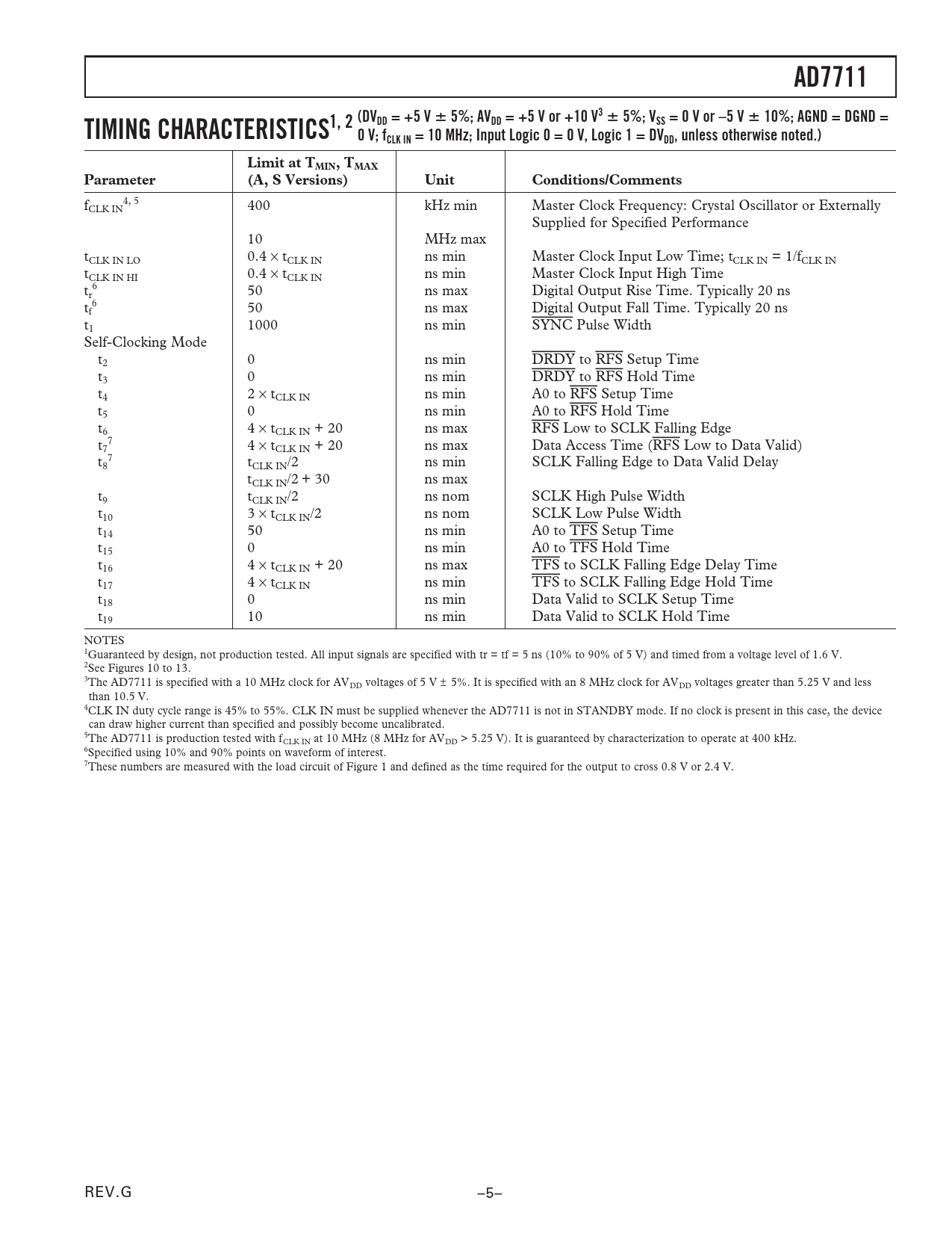 AD7711(DVTIMING CHARACTERISTICS1, 2 DD = +5 V ⴞ 5%; AVDD = +5 V or +10 V3 ⴞ 5%; VSS = 0 V or –5 V ⴞ 10%; AGND = DGND =0 V; fCLK IN = 10 MHz; Input Logic 0 = 0 V, Logic 1 = DVDD, unless otherwise noted.)Limit at TMIN, TMAXParameter(A, S Versions)UnitConditions/Comments f 4, 5 CLK IN 400 kHz min Master Clock Frequency: Crystal Oscillator or Externally Supplied for Specified Performance 10 MHz max 2 tCLK IN LO 0.4 × tCLK IN ns min Master Clock Input Low Time; tCLK IN = 1/fCLK IN tCLK IN HI 0.4 × tCLK IN ns min Master Clock Input High Time t 6 r 50 ns max Digital Output Rise Time. Typically 20 ns t 6 f 50 ns max Digital Output Fall Time. Typically 20 ns t1 1000 ns min SYNC Pulse Width Self-Clocking Mode t2 0 ns min DRDY to RFS Setup Time t3 0 ns min DRDY to RFS Hold Time t4 2 × tCLK IN ns min A0 to RFS Setup Time t5 0 ns min A0 to RFS Hold Time t6 4 × tCLK IN + 20 ns max RFS Low to SCLK Falling Edge t 7 7 4 × tCLK IN + 20 ns max Data Access Time (RFS Low to Data Valid) t 7 8 tCLK IN/2 ns min SCLK Falling Edge to Data Valid Delay tCLK IN/2 + 30 ns max t9 tCLK IN/2 ns nom SCLK High Pulse Width t10 3 × tCLK IN/2 ns nom SCLK Low Pulse Width t14 50 ns min A0 to TFS Setup Time t15 0 ns min A0 to TFS Hold Time t16 4 × tCLK IN + 20 ns max TFS to SCLK Falling Edge Delay Time t17 4 × tCLK IN ns min TFS to SCLK Falling Edge Hold Time t18 0 ns min Data Valid to SCLK Setup Time t19 10 ns min Data Valid to SCLK Hold Time NOTES 1Guaranteed by design, not production tested. All input signals are specified with tr = tf = 5 ns (10% to 90% of 5 V) and timed from a voltage level of 1.6 V. 2See Figures 10 to 13. 3The AD7711 is specified with a 10 MHz clock for AVDD voltages of 5 V ± 5%. It is specified with an 8 MHz clock for AVDD voltages greater than 5.25 V and less than 10.5 V. 4CLK IN duty cycle range is 45% to 55%. CLK IN must be supplied whenever the AD7711 is not in STANDBY mode. If no clock is present in this case, the device can draw higher current than specified and possibly become uncalibrated. 5The AD7711 is production tested with fCLK IN at 10 MHz (8 MHz for AVDD > 5.25 V). It is guaranteed by characterization to operate at 400 kHz. 6Specified using 10% and 90% points on waveform of interest. 7These numbers are measured with the load circuit of Figure 1 and defined as the time required for the output to cross 0.8 V or 2.4 V. REV.G –5– Document Outline FEATURES APPLICATIONS GENERAL DESCRIPTION FUNCTIONAL BLOCK DIAGRAM PRODUCT HIGHLIGHTS SPECIFICATIONS TIMING CHARACTERISTICS PIN FUNCTION DESCRIPTIONS TERMINOLOGY Intergral Nonlinearity Positive Full-Scale Error Unipolar Offset Error Bipolar Zero Error Bipolar Negative Full-Scale Error Positive Full-Scale Overrange Negative Full-Scale Overrange Offset Calibration Range Full-Scale Calibration Range Input Span CONTROL REGISTER (24 BITS) FILTER SELECTION (FS11–FS0) CIRCUIT DESCRIPTION THEORY OF OPERATION Input Sample Rate DIGITAL FILTERING Filter Characteristics Post Filtering Antialias Considerations ANALOG INPUT FUNCTIONS Analog Input Ranges Burnout Current RTD Excitation Current Bipolar/Unipolar Inputs REFERENCE INPUT/OUTPUT VBIAS Input USING THE AD7711 SYSTEM DESIGN CONSIDERATIONS Clocking System Synchronization Accuracy Autocalibration Self-Calibration System Calibration System Offset Calibration Background Calibration Span and Offset Limits POWER-UP AND CALIBRATION Drift Considerations POWER SUPPLIES AND GROUNDING DIGITAL INTERFACE Self-Clocking Mode Read Operation Write Operation External Clocking Mode Read Operation Write Operation SIMPLIFYING THE EXTERNAL CLOCKING MODE INTERFACE MICROCOMPUTER/MICROPROCESSOR INTERFACING AD7711 to 8051 Interface AD7711 to 68HC11 Interface APPLICATIONS 4-Wire RTD Configurations 3-Wire RTD Configurations OUTLINE DIMENSIONS Revision History