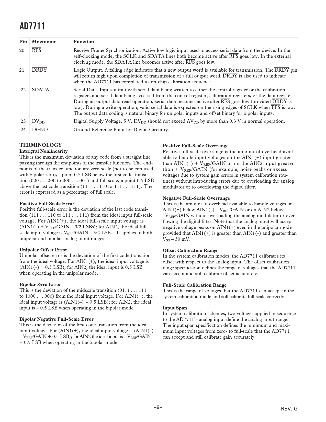 AD7711 Pin Mnemonic Function TERMINOLOGY Positive Full-Scale Overrange Intergral Nonlinearity Negative Full-Scale Overrange