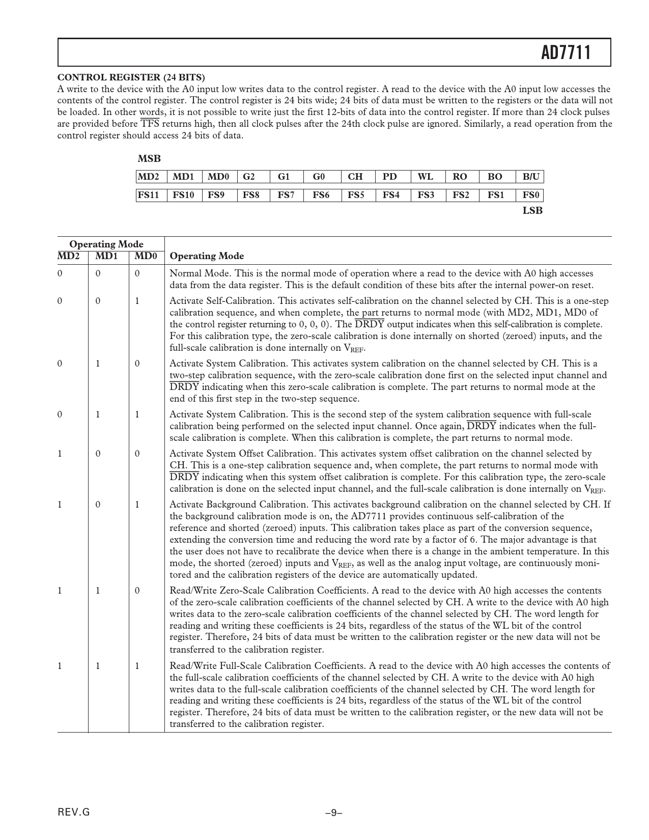 AD7711CONTROL REGISTER (24 BITS) A write to the device with the A0 input low writes data to the control register. A read to the device with the A0 input low accesses the contents of the control register. The control register is 24 bits wide; 24 bits of data must be written to the registers or the data will not be loaded. In other words, it is not possible to write just the first 12-bits of data into the control register. If more than 24 clock pulses are provided before TFS returns high, then all clock pulses after the 24th clock pulse are ignored. Similarly, a read operation from the control register should access 24 bits of data. MSB2MD2MD1MD0G2G1G0CHPDWLROBOB/UFS11FS10FS9FS8FS7FS6FS5FS4FS3FS2FS1FS0LSBOperating ModeMD2MD1MD0Operating Mode 0 0 0 Normal Mode. This is the normal mode of operation where a read to the device with A0 high accesses data from the data register. This is the default condition of these bits after the internal power-on reset. 0 0 1 Activate Self-Calibration. This activates self-calibration on the channel selected by CH. This is a one-step calibration sequence, and when complete, the part returns to normal mode (with MD2, MD1, MD0 of the control register returning to 0, 0, 0). The DRDY output indicates when this self-calibration is complete. For this calibration type, the zero-scale calibration is done internally on shorted (zeroed) inputs, and the full-scale calibration is done internally on VREF. 0 1 0 Activate System Calibration. This activates system calibration on the channel selected by CH. This is a two-step calibration sequence, with the zero-scale calibration done first on the selected input channel and DRDY indicating when this zero-scale calibration is complete. The part returns to normal mode at the end of this first step in the two-step sequence. 0 1 1 Activate System Calibration. This is the second step of the system calibration sequence with full-scale calibration being performed on the selected input channel. Once again, DRDY indicates when the full- scale calibration is complete. When this calibration is complete, the part returns to normal mode. 1 0 0 Activate System Offset Calibration. This activates system offset calibration on the channel selected by CH. This is a one-step calibration sequence and, when complete, the part returns to normal mode with DRDY indicating when this system offset calibration is complete. For this calibration type, the zero-scale calibration is done on the selected input channel, and the full-scale calibration is done internally on VREF. 1 0 1 Activate Background Calibration. This activates background calibration on the channel selected by CH. If the background calibration mode is on, the AD7711 provides continuous self-calibration of the reference and shorted (zeroed) inputs. This calibration takes place as part of the conversion sequence, extending the conversion time and reducing the word rate by a factor of 6. The major advantage is that the user does not have to recalibrate the device when there is a change in the ambient temperature. In this mode, the shorted (zeroed) inputs and VREF, as well as the analog input voltage, are continuously moni- tored and the calibration registers of the device are automatically updated. 1 1 0 Read/Write Zero-Scale Calibration Coefficients. A read to the device with A0 high accesses the contents of the zero-scale calibration coefficients of the channel selected by CH. A write to the device with A0 high writes data to the zero-scale calibration coefficients of the channel selected by CH. The word length for reading and writing these coefficients is 24 bits, regardless of the status of the WL bit of the control register. Therefore, 24 bits of data must be written to the calibration register or the new data will not be transferred to the calibration register. 1 1 1 Read/Write Full-Scale Calibration Coefficients. A read to the device with A0 high accesses the contents of the full-scale calibration coefficients of the channel selected by CH. A write to the device with A0 high writes data to the full-scale calibration coefficients of the channel selected by CH. The word length for reading and writing these coefficients is 24 bits, regardless of the status of the WL bit of the control register. Therefore, 24 bits of data must be written to the calibration register, or the new data will not be transferred to the calibration register. REV.G –9– Document Outline FEATURES APPLICATIONS GENERAL DESCRIPTION FUNCTIONAL BLOCK DIAGRAM PRODUCT HIGHLIGHTS SPECIFICATIONS TIMING CHARACTERISTICS PIN FUNCTION DESCRIPTIONS TERMINOLOGY Intergral Nonlinearity Positive Full-Scale Error Unipolar Offset Error Bipolar Zero Error Bipolar Negative Full-Scale Error Positive Full-Scale Overrange Negative Full-Scale Overrange Offset Calibration Range Full-Scale Calibration Range Input Span CONTROL REGISTER (24 BITS) FILTER SELECTION (FS11–FS0) CIRCUIT DESCRIPTION THEORY OF OPERATION Input Sample Rate DIGITAL FILTERING Filter Characteristics Post Filtering Antialias Considerations ANALOG INPUT FUNCTIONS Analog Input Ranges Burnout Current RTD Excitation Current Bipolar/Unipolar Inputs REFERENCE INPUT/OUTPUT VBIAS Input USING THE AD7711 SYSTEM DESIGN CONSIDERATIONS Clocking System Synchronization Accuracy Autocalibration Self-Calibration System Calibration System Offset Calibration Background Calibration Span and Offset Limits POWER-UP AND CALIBRATION Drift Considerations POWER SUPPLIES AND GROUNDING DIGITAL INTERFACE Self-Clocking Mode Read Operation Write Operation External Clocking Mode Read Operation Write Operation SIMPLIFYING THE EXTERNAL CLOCKING MODE INTERFACE MICROCOMPUTER/MICROPROCESSOR INTERFACING AD7711 to 8051 Interface AD7711 to 68HC11 Interface APPLICATIONS 4-Wire RTD Configurations 3-Wire RTD Configurations OUTLINE DIMENSIONS Revision History