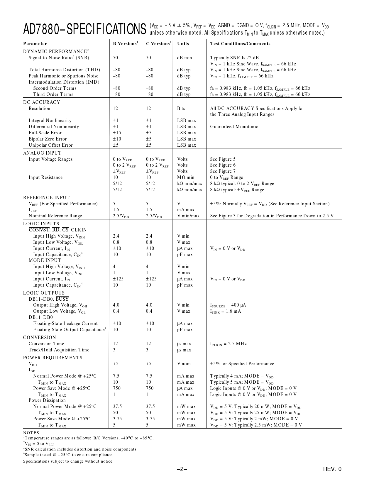 AD7880–SPECIFICATIONS (VDD = +5 V 6 5%, VREF = VDD, AGND = DGND = O V, fCLKIN = 2.5 MHz, MODE = VDDunless otherwise noted. All Specifications TMIN to TMAX unless otherwise noted.)ParameterB Versions1C Versions1UnitsTest Conditions/Comments DYNAMIC PERFORMANCE2 Signal-to-Noise Ratio3 (SNR) 70 70 dB min Typically SNR Is 72 dB VIN = 1 kHz Sine Wave, fSAMPLE = 66 kHz Total Harmonic Distortion (THD) –80 –80 dB typ VIN = 1 kHz Sine Wave, fSAMPLE = 66 kHz Peak Harmonic or Spurious Noise –80 –80 dB typ VIN = 1 kHz, fSAMPLE = 66 kHz Intermodulation Distortion (IMD) Second Order Terms –80 –80 dB typ fa = 0.983 kHz, fb = 1.05 kHz, fSAMPLE = 66 kHz Third Order Terms –80 –80 dB typ fa = 0.983 kHz, fb = 1.05 kHz, fSAMPLE = 66 kHz DC ACCURACY Resolution 12 12 Bits All DC ACCURACY Specifications Apply for the Three Analog Input Ranges Integral Nonlinearity ±1 ±1 LSB max Differential Nonlinearity ±1 ±1 LSB max Guaranteed Monotonic Full-Scale Error ±15 ±5 LSB max Bipolar Zero Error ±10 ±5 LSB max Unipolar Offset Error ±5 ±5 LSB max ANALOG INPUT Input Voltage Ranges 0 to VREF 0 to VREF Volts See Figure 5 0 to 2 VREF 0 to 2 VREF Volts See Figure 6 ±V ± REF VREF Volts See Figure 7 Input Resistance 10 10 MΩ min 0 to VREF Range 5/12 5/12 kΩ min/max 8 kΩ typical: 0 to 2 VREF Range 5/12 5/12 kΩ min/max 8 kΩ typical: ± VREF Range REFERENCE INPUT VREF (For Specified Performance) 5 5 V ±5%: Normally VREF = VDD (See Reference Input Section) IREF 1.5 1.5 mA max Nominal Reference Range 2.5/VDD 2.5/VDD V min/max See Figure 3 for Degradation in Performance Down to 2.5 V LOGIC INPUTS CONVST, RD, CS, CLKIN Input High Voltage, VINH 2.4 2.4 V min Input Low Voltage, VINL 0.8 0.8 V max Input Current, I ± IN 10 ±10 µA max VIN = 0 V or VDD Input Capacitance, C 4 IN 10 10 pF max MODE INPUT Input High Voltage, VINH 4 4 V min Input Low Voltage, VINL 1 1 V max Input Current, I ± IN 125 ±125 µA max VIN = 0 V or VDD Input Capacitance, C 4 IN 10 10 pF max LOGIC OUTPUTS DB11–DB0, BUSY Output High Voltage, VOH 4.0 4.0 V min ISOURCE = 400 µA Output Low Voltage, VOL 0.4 0.4 V max ISINK = 1.6 mA DB11–DB0 Floating-State Leakage Current ±10 ±10 µA max Floating-State Output Capacitance4 10 10 pF max CONVERSION Conversion Time 12 12 µs max fCLKIN = 2.5 MHz Track/Hold Acquisition Time 3 3 µs max POWER REQUIREMENTS VDD +5 +5 V nom ±5% for Specified Performance IDD Normal Power Mode @ +25°C 7.5 7.5 mA max Typically 4 mA; MODE = VDD TMIN to TMAX 10 10 mA max Typically 5 mA; MODE = VDD Power Save Mode @ +25°C 750 750 µA max Logic Inputs @ 0 V or VDD; MODE = 0 V TMIN to TMAX 1 1 mA max Logic Inputs @ 0 V or VDD; MODE = 0 V Power Dissipation Normal Power Mode @ +25°C 37.5 37.5 mW max VDD = 5 V: Typically 20 mW; MODE = VDD TMIN to TMAX 50 50 mW max VDD = 5 V: Typically 25 mW; MODE = VDD Power Save Mode @ +25°C 3.75 3.75 mW max VDD = 5 V: Typically 2 mW; MODE = 0 V TMIN to TMAX 5 5 mW max VDD = 5 V: Typically 2.5 mW; MODE = 0 V NOTES 1Temperature ranges are as follows: B/C Versions, –40°C to +85°C. 2VIN = 0 to VREF 3SNR calculation includes distortion and noise components. 4Sample tested @ +25°C to ensure compliance. Specifications subject to change without notice. –2– REV. 0