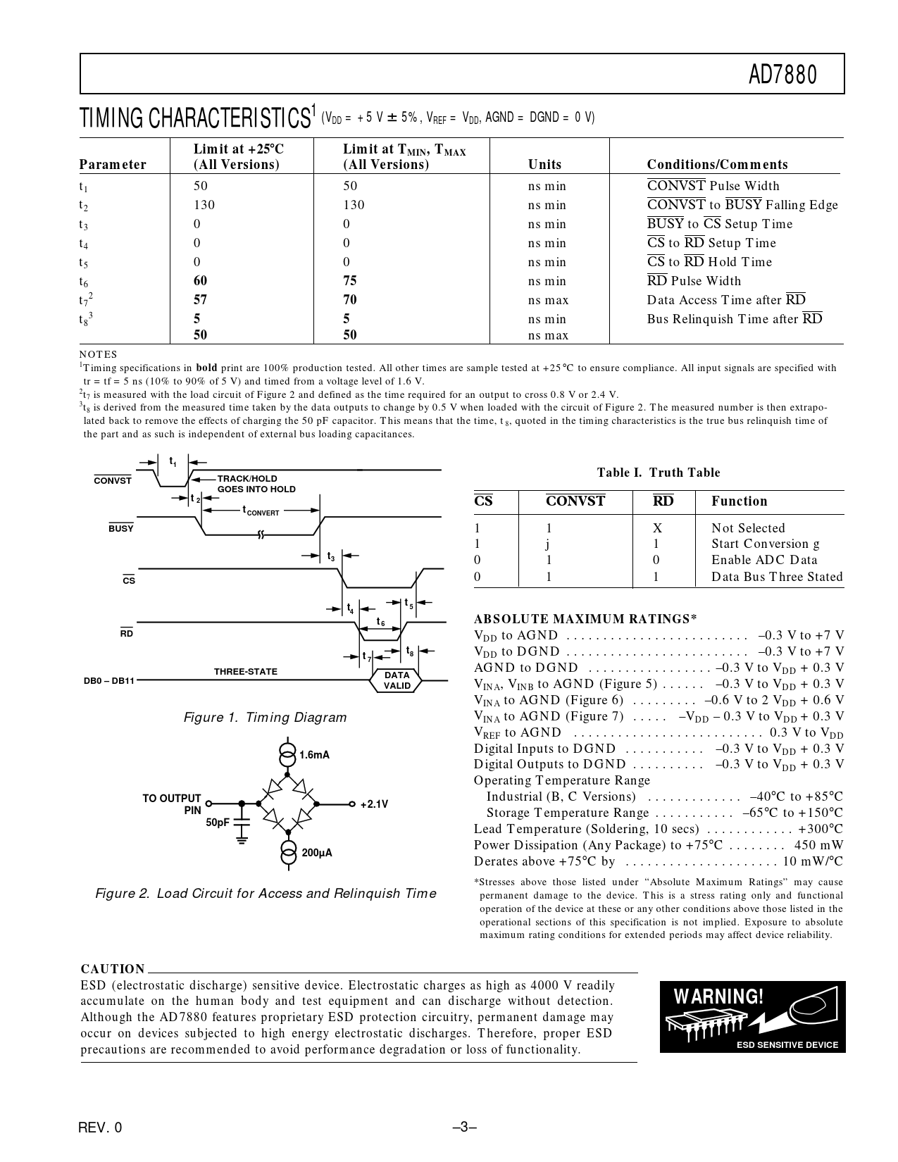AD7880TIMING CHARACTERISTICS1 (VDD = +5 V 6 5%, VREF = VDD, AGND = DGND = 0 V)Limit at +25 8 CLimit at TMIN, TMAXParameter(All Versions)(All Versions)UnitsConditions/Comments t1 50 50 ns min CONVST Pulse Width t2 130 130 ns min CONVST to BUSY Falling Edge t3 0 0 ns min BUSY to CS Setup Time t4 0 0 ns min CS to RD Setup Time t5 0 0 ns min CS to RD Hold Time t6 6075 ns min RD Pulse Width t 2 7 5770 ns max Data Access Time after RD t 3 8 55 ns min Bus Relinquish Time after RD 5050 ns max NOTES 1Timing specifications in bold print are 100% production tested. All other times are sample tested at +25 °C to ensure compliance. All input signals are specified with tr = tf = 5 ns (10% to 90% of 5 V) and timed from a voltage level of 1.6 V. 2t7 is measured with the load circuit of Figure 2 and defined as the time required for an output to cross 0.8 V or 2.4 V. 3t8 is derived from the measured time taken by the data outputs to change by 0.5 V when loaded with the circuit of Figure 2. The measured number is then extrapo- lated back to remove the effects of charging the 50 pF capacitor. This means that the time, t 8, quoted in the timing characteristics is the true bus relinquish time of the part and as such is independent of external bus loading capacitances. t1Table I. Truth TableCONVSTTRACK/HOLD GOES INTO HOLDt 2CSCONVSTRDFunctiont CONVERTBUSY 1 1 X Not Selected 1 j 1 Start Conversion g t3 0 1 0 Enable ADC Data 0 1 1 Data Bus Three Stated CStt54tABSOLUTE MAXIMUM RATINGS*6RD VDD to AGND . –0.3 V to +7 V t8 V t DD to DGND . –0.3 V to +7 V 7 AGND to DGND . –0.3 V to V THREE-STATE DD + 0.3 V DATADB0 – DB11VALID VINA, VINB to AGND (Figure 5) . –0.3 V to VDD + 0.3 V VINA to AGND (Figure 6) . –0.6 V to 2 VDD + 0.6 V Figure 1. Timing Diagram VINA to AGND (Figure 7) . –VDD – 0.3 V to VDD + 0.3 V VREF to AGND . 0.3 V to VDD Digital Inputs to DGND . –0.3 V to VDD + 0.3 V 1.6mA Digital Outputs to DGND . –0.3 V to VDD + 0.3 V Operating Temperature Range TO OUTPUT Industrial (B, C Versions) . –40°C to +85°C + 2.1VPIN Storage Temperature Range . –65°C to +150°C 50pF Lead Temperature (Soldering, 10 secs) . +300°C Power Dissipation (Any Package) to +75°C . 450 mW 200µA Derates above +75°C by . 10 mW/°C *Stresses above those listed under “Absolute Maximum Ratings” may cause Figure 2. Load Circuit for Access and Relinquish Time permanent damage to the device. This is a stress rating only and functional operation of the device at these or any other conditions above those listed in the operational sections of this specification is not implied. Exposure to absolute maximum rating conditions for extended periods may affect device reliability. CAUTION ESD (electrostatic discharge) sensitive device. Electrostatic charges as high as 4000 V readily accumulate on the human body and test equipment and can discharge without detection. WARNING! Although the AD7880 features proprietary ESD protection circuitry, permanent damage may occur on devices subjected to high energy electrostatic discharges. Therefore, proper ESD ESD SENSITIVE DEVICE precautions are recommended to avoid performance degradation or loss of functionality. REV. 0 –3–