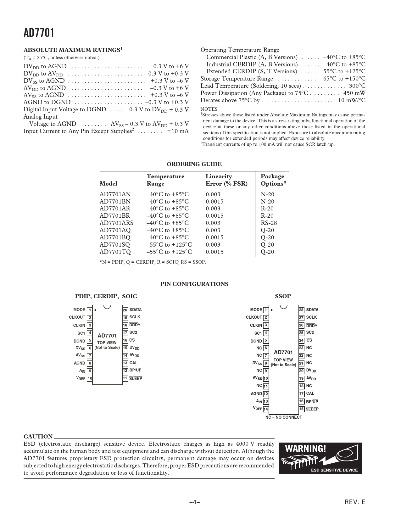 AD7701ABSOLUTE MAXIMUM RATINGS1 Operating Temperature Range (T Commercial Plastic (A, B Versions) . –40°C to +85°C A = 25°C, unless otherwise noted.) DV Industrial CERDIP (A, B Versions) . –40°C to +85°C DD to AGND . –0.3 V to +6 V DV Extended CERDIP (S, T Versions) . –55°C to +125°C DD to AVDD . –0.3 V to +0.3 V DV Storage Temperature Range. –65°C to +150°C SS to AGND . +0.3 V to –6 V AV Lead Temperature (Soldering, 10 secs) . 300°C DD to AGND . –0.3 V to +6 V AV Power Dissipation (Any Package) to 75°C . 450 mW SS to AGND . +0.3 V to –6 V AGND to DGND . –0.3 V to +0.3 V Derates above 75°C by . 10 mW/°C Digital Input Voltage to DGND . –0.3 V to DV NOTES DD + 0.3 V 1 Analog Input Stresses above those listed under Absolute Maximum Ratings may cause perma- nent damage to the device. This is a stress rating only; functional operation of the Voltage to AGND . AVSS – 0.3 V to AVDD + 0.3 V device at these or any other conditions above those listed in the operational Input Current to Any Pin Except Supplies2 . ± 10 mA sections of this specification is not implied. Exposure to absolute maximum rating conditions for extended periods may affect device reliability. 2Transient currents of up to 100 mA will not cause SCR latch-up. ORDERING GUIDETemperatureLinearityPackageModelRangeError (% FSR)Options* AD7701AN –40°C to +85°C 0.003 N-20 AD7701BN –40°C to +85°C 0.0015 N-20 AD7701AR –40°C to +85°C 0.003 R-20 AD7701BR –40°C to +85°C 0.0015 R-20 AD7701ARS –40°C to +85°C 0.003 RS-28 AD7701AQ –40°C to +85°C 0.003 Q-20 AD7701BQ –40°C to +85°C 0.0015 Q-20 AD7701SQ –55°C to +125°C 0.003 Q-20 AD7701TQ –55°C to +125°C 0.0015 Q-20 *N = PDIP; Q = CERDIP; R = SOIC; RS = SSOP. PIN CONFIGURATIONSPDIP, CERDIP, SOICSSOPMODE120 SDATAMODE 128 SDATACLKOUT219 SCLKCLKOUT 227 SCLKCLKIN318 DRDYCLKIN 326 DRDYSC1417 SC2425 SC2AD7701SC1DGND516 CS524 CSTOP VIEWDGNDDV6 (Not to Scale) 15 DVSSDDNC 623 NCAD7701AVSS14 AV7DDNC 722 NCTOP VIEWAGND813 CALDVSS 8 (Not to Scale) 21 NCA12 BP / 9UPINNC 920 DVDDVREF 1011 SLEEPAVSS 1019 AVDDNC 1118 NCAGND 1217 CALAIN 1316 BP / UPVREF 1415 SLEEPNC = NO CONNECTCAUTION ESD (electrostatic discharge) sensitive device. Electrostatic charges as high as 4000 V readily accumulate on the human body and test equipment and can discharge without detection. Although the AD7701 features proprietary ESD protection circuitry, permanent damage may occur on devices subjected to high energy electrostatic discharges. Therefore, proper ESD precautions are recommended to avoid performance degradation or loss of functionality. –4– REV. E Document Outline FEATURES APPLICATIONS GENERAL DESCRIPTION FUNCTIONAL BLOCK DIAGRAM PRODUCT HIGHLIGHTS SPECIFICATIONS ABSOLUTE MAXIMUM RATINGS ORDERING GUIDE PIN CONFIGURATIONS PIN FUNCTION DESCRIPTIONS TIMING CHARACTERISTICS DEFINITION OF TERMS Linearity Error Differential Linearity Error Positive Full-Scale Error Unipolar Offset Error Bipolar Zero Error Bipolar Negative Full-Scale Error Positive Full-Scale Overrange Negative Full-Scale Overrange Offset Calibration Range Full-Scale Calibration Range Input Span GENERAL DESCRIPTION THEORY OF OPERATION DIGITAL FILTERING FILTER CHARACTERISTICS USING THE AD7701 SYSTEM DESIGN CONSIDERATIONS CLOCKING ANALOG INPUT RANGES INPUT SIGNAL CONDITIONING Source Resistance Antialias Considerations VOLTAGE REFERENCE CONNECTIONS GROUNDING AND SUPPLY DECOUPLING ACCURACY AND AUTOCALIBRATION CALIBRATION RANGE POWER-UP AND CALIBRATION POWER SUPPLY SEQUENCING GROUNDING SINGLE-SUPPLY OPERATION SLEEP MODE DIGITAL INTERFACE Synchronous Self-Clocking Mode (SSC) Synchronous External Clock Mode (SEC) Asynchronous Communications (AC) Mode DIGITAL NOISE AND OUTPUT LOADING OUTLINE DIMENSIONS Revision History