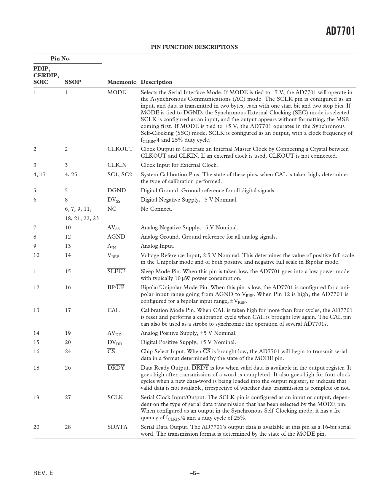 AD7701 PIN FUNCTION DESCRIPTIONS Pin No. PDIP, CERDIP, SOIC SSOP Mnemonic Description