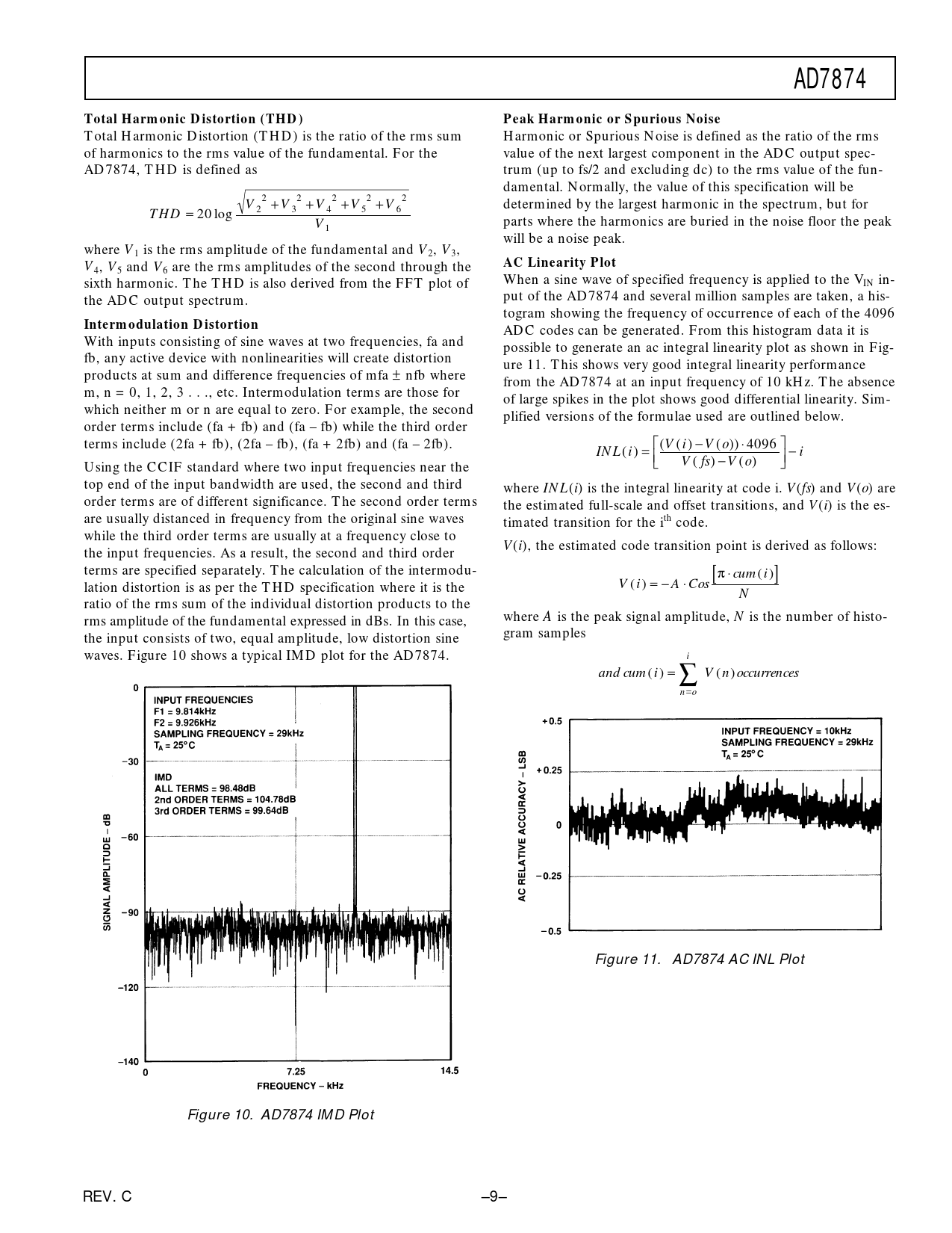 AD7874Total Harmonic Distortion (THD)Peak Harmonic or Spurious Noise Total Harmonic Distortion (THD) is the ratio of the rms sum Harmonic or Spurious Noise is defined as the ratio of the rms of harmonics to the rms value of the fundamental. For the value of the next largest component in the ADC output spec- AD7874, THD is defined as trum (up to fs/2 and excluding dc) to the rms value of the fun- damental. Normally, the value of this specification will be 2 2 2 2 2 V +V +V +V +V determined by the largest harmonic in the spectrum, but for THD = 20 log 2 3 4 5 6 parts where the harmonics are buried in the noise floor the peak V1 will be a noise peak. where V1 is the rms amplitude of the fundamental and V2, V3, V AC Linearity Plot 4, V5 and V6 are the rms amplitudes of the second through the sixth harmonic. The THD is also derived from the FFT plot of When a sine wave of specified frequency is applied to the VIN in- the ADC output spectrum. put of the AD7874 and several million samples are taken, a his- togram showing the frequency of occurrence of each of the 4096 Intermodulation Distortion ADC codes can be generated. From this histogram data it is With inputs consisting of sine waves at two frequencies, fa and possible to generate an ac integral linearity plot as shown in Fig- fb, any active device with nonlinearities will create distortion ure 11. This shows very good integral linearity performance products at sum and difference frequencies of mfa ± nfb where from the AD7874 at an input frequency of 10 kHz. The absence m, n = 0, 1, 2, 3 . ., etc. Intermodulation terms are those for of large spikes in the plot shows good differential linearity. Sim- which neither m or n are equal to zero. For example, the second plified versions of the formulae used are outlined below. order terms include (fa + fb) and (fa – fb) while the third order terms include (2fa + fb), (2fa – fb), (fa + 2fb) and (fa – 2fb). INL(i ) = (V (i ) − V (o)) ⋅ 4096 Using the CCIF standard where two input frequencies near the V ( fs) −V(o) − i top end of the input bandwidth are used, the second and third where INL(i) is the integral linearity at code i. V(fs) and V(o) are order terms are of different significance. The second order terms the estimated full-scale and offset transitions, and V(i) is the es- are usually distanced in frequency from the original sine waves timated transition for the ith code. while the third order terms are usually at a frequency close to V(i), the estimated code transition point is derived as follows: the input frequencies. As a result, the second and third order terms are specified separately. The calculation of the intermodu- π ⋅ cum(i) [ ] lation distortion is as per the THD specification where it is the V (i ) = − A ⋅ Cos N ratio of the rms sum of the individual distortion products to the rms amplitude of the fundamental expressed in dBs. In this case, where A is the peak signal amplitude, N is the number of histo- the input consists of two, equal amplitude, low distortion sine gram samples waves. Figure 10 shows a typical IMD plot for the AD7874. i and cum(i ) = ∑ V(n)occurrences n =o Figure 11. AD7874 AC INL Plot Figure 10. AD7874 IMD Plot REV. C –9–