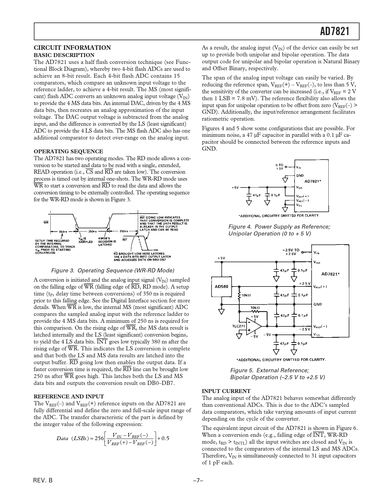 AD7821CIRCUIT INFORMATION As a result, the analog input (VIN) of the device can easily be set BASIC DESCRIPTION up to provide both unipolar and bipolar operation. The data The AD7821 uses a half flash conversion technique (see Func- output code for unipolar and bipolar operation is Natural Binary tional Block Diagram), whereby two 4-bit flash ADCs are used to and Offset Binary, respectively. achieve an 8-bit result. Each 4-bit flash ADC contains 15 The span of the analog input voltage can easily be varied. By comparators, which compare an unknown input voltage to the reducing the reference span, VREF(+) – VREF(–), to less than 5 V, reference ladder, to achieve a 4-bit result. The MS (most signifi- the sensitivity of the converter can be increased (i.e., if VREF = 2 V cant) flash ADC converts an unknown analog input voltage (VIN) then 1 LSB = 7.8 mV). The reference flexibility also allows the to provide the 4 MS data bits. An internal DAC, driven by the 4 MS input span for unipolar operation to be offset from zero (VREF(–) > data bits, then recreates an analog approximation of the input GND). Additionally, the input/reference arrangement facilitates voltage. The DAC output voltage is subtracted from the analog ratiometric operation. input, and the difference is converted by the LS (least significant) ADC to provide the 4 LS data bits. The MS flash ADC also has one Figures 4 and 5 show some configurations that are possible. For additional comparator to detect over-range on the analog input. minimum noise, a 47 µF capacitor in parallel with a 0.1 µF ca- pacitor should be connected between the reference inputs and GND. OPERATING SEQUENCE The AD7821 has two operating modes. The RD mode allows a con- version to be started and data to be read with a single, extended, READ operation (i.e., CS and RD are taken low). The conversion process is timed out by internal one-shots. The WR-RD mode uses WR to start a conversion and RD to read the data and allows the conversion timing to be externally controlled. The operating sequence for the WR-RD mode is shown in Figure 3. Figure 4. Power Supply as Reference; Unipolar Operation (0 to + 5 V) Figure 3. Operating Sequence (WR-RD Mode) A conversion is initiated and the analog input signal (VIN) sampled on the falling edge of WR (falling edge of RD, RD mode). A setup time (tP, delay time between conversions) of 350 ns is required prior to this falling edge. See the Digital Interface section for more details. When WR is low, the internal MS (most significant) ADC compares the sampled analog input with the reference ladder to provide the 4 MS data bits. A minimum of 250 ns is required for this comparison. On the rising edge of WR, the MS data result is latched internally and the LS (least significant) conversion begins, to yield the 4 LS data bits. INT goes low typically 380 ns after the rising edge of WR. This indicates the LS conversion is complete and that both the LS and MS data results are latched into the output buffer. RD going low then enables the output data. If a faster conversion time is required, the RD line can be brought low Figure 5. External Reference; 250 ns after WR goes high. This latches both the LS and MS Bipolar Operation (–2.5 V to +2.5 V) data bits and outputs the conversion result on DB0–DB7. INPUT CURRENTREFERENCE AND INPUT The analog input of the AD7821 behaves somewhat differently The VREF(–) and VREF(+) reference inputs on the AD7821 are than conventional ADCs. This is due to the ADC’s sampled fully differential and define the zero and full-scale input range of data comparators, which take varying amounts of input current the ADC. The transfer characteristic of the part is defined by depending on the cycle of the converter. the integer value of the following expression: The equivalent input circuit of the AD7821 is shown in Figure 6. V −V (−) When a conversion ends (e.g., falling edge of INT, WR-RD Data (LSBs ) = 256 IN REF V (+) − V (−) mode, t REF REF + 0.5 RD > tINTL) all the input switches are closed and VIN is connected to the comparators of the internal LS and MS ADCs. Therefore, VIN is simultaneously connected to 31 input capacitors of 1 pF each. REV. B –7– Document Outline FEATURES GENERAL DESCRIPTION FUNCTIONAL BLOCK DIAGRAM PRODUCT HIGHLIGHTS SPECIFICATIONS Test Circuits ORDERING GUIDE ABSOLUTE MAXIMUM RATINGS PIN CONFIGURATIONS PIN FUNCTION DESCRIPTIONS TERMINOLOGY LEAST SIGNIFICANT BIT (LSB) TOTAL UNADJUSTED ERROR SLEW RATE TOTAL HARMONIC DISTORTION INTERMODULATION DISTORTION SIGNAL-TO-NOISE RATIO PEAK HARMONIC OR SPURIOUS NOISE Typical Performance Characteristics CIRCUIT INFORMATION BASIC DESCRIPTION OPERATING SEQUENCE REFERENCE AND INPUT INPUT CURRENT INPUT TRANSIENTS INHERENT TRACK-AND-HOLD SINUSOIDAL INPUTS DIGITAL SIGNAL PROCESSING APPLICATIONS SIGNAL-TO-NOISE RATIO AND DISTORTION EFFECTIVE NUMBER OF BITS INTERMODULATION DISTORTION HISTOGRAM PLOT DIGITAL INTERFACE RD Mode (MODE = 0) WR-RD Mode (MODE = 1) MICROPROCESSOR INTERFACING AD7821 – 68008 INTERFACE AD7821 – 8088 INTERFACE AD7821 – TMS32010 INTERFACE AD7821 – 8051 INTERFACE APPLYING THE AD7821 UNIPOLAR OPERATION BIPOLAR OPERATION 16-CHANNEL TELECOM A/D CONVERTER SIMULTANEOUS SAMPLING ADCS OUTLINE DIMENSIONS Revision History