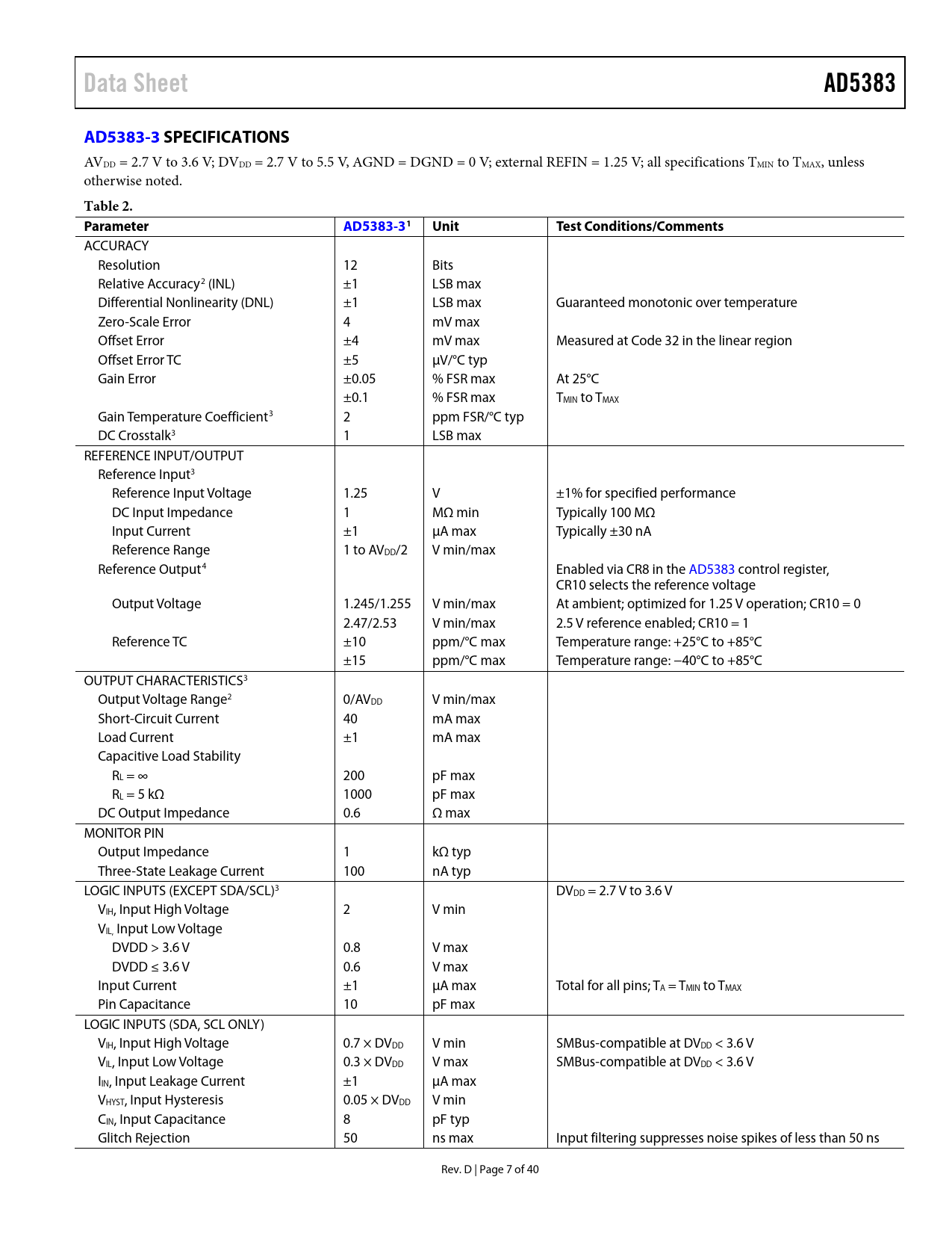link to page 9 link to page 9 link to page 9 link to page 9 link to page 9 link to page 9 link to page 9 link to page 9 link to page 9 Data SheetAD5383AD5383-3 SPECIFICATIONS AVDD = 2.7 V to 3.6 V; DVDD = 2.7 V to 5.5 V, AGND = DGND = 0 V; external REFIN = 1.25 V; all specifications TMIN to TMAX, unless otherwise noted. Table 2. ParameterAD5383-31UnitTest Conditions/Comments ACCURACY Resolution 12 Bits Relative Accuracy2 (INL) ±1 LSB max Differential Nonlinearity (DNL) ±1 LSB max Guaranteed monotonic over temperature Zero-Scale Error 4 mV max Offset Error ±4 mV max Measured at Code 32 in the linear region Offset Error TC ±5 µV/°C typ Gain Error ±0.05 % FSR max At 25°C ±0.1 % FSR max TMIN to TMAX Gain Temperature Coefficient3 2 ppm FSR/°C typ DC Crosstalk3 1 LSB max REFERENCE INPUT/OUTPUT Reference Input3 Reference Input Voltage 1.25 V ±1% for specified performance DC Input Impedance 1 MΩ min Typically 100 MΩ Input Current ±1 µA max Typically ±30 nA Reference Range 1 to AVDD/2 V min/max Reference Output4 Enabled via CR8 in the AD5383 control register, CR10 selects the reference voltage Output Voltage 1.245/1.255 V min/max At ambient; optimized for 1.25 V operation; CR10 = 0 2.47/2.53 V min/max 2.5 V reference enabled; CR10 = 1 Reference TC ±10 ppm/°C max Temperature range: +25°C to +85°C ±15 ppm/°C max Temperature range: −40°C to +85°C OUTPUT CHARACTERISTICS3 Output Voltage Range2 0/AVDD V min/max Short-Circuit Current 40 mA max Load Current ±1 mA max Capacitive Load Stability RL = ∞ 200 pF max RL = 5 kΩ 1000 pF max DC Output Impedance 0.6 Ω max MONITOR PIN Output Impedance 1 kΩ typ Three-State Leakage Current 100 nA typ LOGIC INPUTS (EXCEPT SDA/SCL)3 DVDD = 2.7 V to 3.6 V VIH, Input High Voltage 2 V min VIL, Input Low Voltage DVDD > 3.6 V 0.8 V max DVDD ≤ 3.6 V 0.6 V max Input Current ±1 µA max Total for all pins; TA = TMIN to TMAX Pin Capacitance 10 pF max LOGIC INPUTS (SDA, SCL ONLY) VIH, Input High Voltage 0.7 × DVDD V min SMBus-compatible at DVDD < 3.6 V VIL, Input Low Voltage 0.3 × DVDD V max SMBus-compatible at DVDD < 3.6 V IIN, Input Leakage Current ±1 µA max VHYST, Input Hysteresis 0.05 × DVDD V min CIN, Input Capacitance 8 pF typ Glitch Rejection 50 ns max Input filtering suppresses noise spikes of less than 50 ns Rev. D | Page 7 of 40 Document Outline Features Integrated Functions Applications Functional Block Diagram Table of Contents Revision History General Description Specifications AD5383-5 Specifications AD5383-3 Specifications AC Characteristics9F Timing Characteristics Serial Interface Timing I2C Serial Interface Timing Parallel Interface Timing Absolute Maximum Ratings ESD Caution Pin Configuration and Function Descriptions Terminology Typical Performance Characteristics Functional Description DAC Architecture—General Data Decoding On-Chip Special Function Registers (SFR) SFR Commands NOP (No Operation) Write CLR Code Soft CLR Soft Power-Down Soft Power-Up Soft RESET Control Register Write/Read Channel Monitor Function Hardware Functions Reset Function Asynchronous Clear Function BUSY\ and LDAC\ Functions FIFO Operation in Parallel Mode Power-On Reset Power-Down Interfaces DSP-, SPI-, MICROWIRE-Compatible Serial Interfaces Standalone Mode Daisy-Chain Mode Readback Mode I2C Serial Interface I2C Data Transfer START and STOP Conditions Repeated START Conditions Acknowledge Bit (ACK) AD5383 Slave Addresses Write Operation 4-Byte Mode 3-Byte Mode 2-Byte Mode Parallel Interface CS\ Pin WR\ Pin REG0, REG1 Pins Pins A4 to A0 Pins DB11 to DB0 Microprocessor Interfacing Parallel Interface AD5383 to MC68HC11 AD5383 to PIC16C6x/7x AD5383 to 8051 AD5383 to ADSP-BF527 Applications Information Power Supply Decoupling Power Supply Sequencing Typical Configuration Circuit Channel Monitor Function Toggle Mode Function Thermal Monitor Function Optical Attenuators Utilizing the FIFO Outline Dimensions Ordering Guide