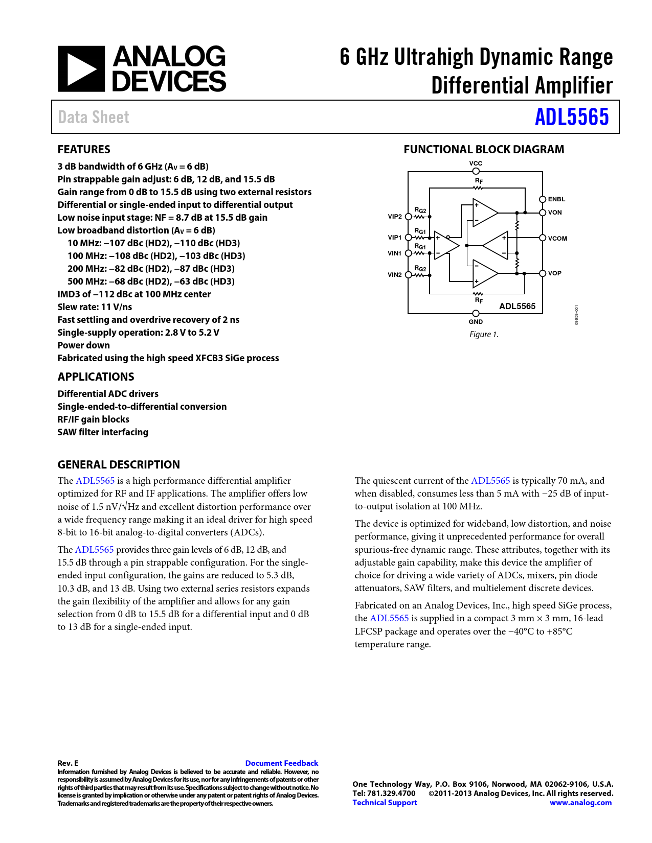 6 GHz Ultrahigh Dynamic Range. Differential Amplifier. Data Sheet. ADL5565. FEATURES. FUNCTIONAL BLOCK DIAGRAM