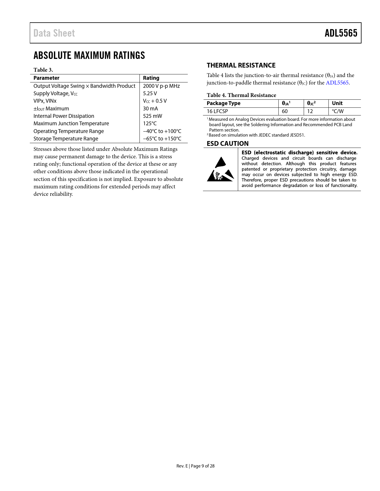 Data Sheet ADL5565 ABSOLUTE MAXIMUM RATINGS THERMAL RESISTANCE Table 3 Parameter Rating Table 4 Thermal Resistance