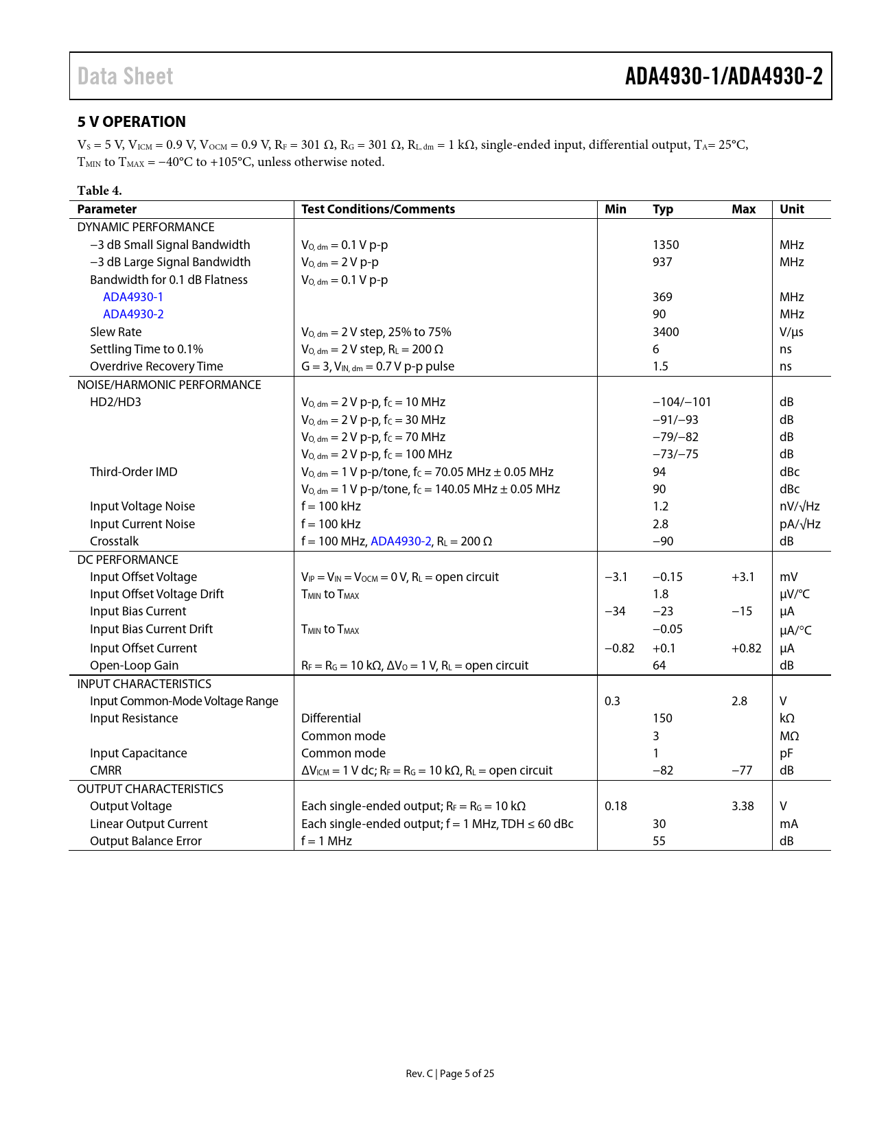 Data SheetADA4930-1/ADA4930-25 V OPERATION VS = 5 V, VICM = 0.9 V, VOCM = 0.9 V, RF = 301 Ω, RG = 301 Ω, RL, dm = 1 kΩ, single-ended input, differential output, TA= 25°C, TMIN to TMAX = −40°C to +105°C, unless otherwise noted. Table 4. ParameterTest Conditions/CommentsMinTypMaxUnit DYNAMIC PERFORMANCE −3 dB Small Signal Bandwidth VO, dm = 0.1 V p-p 1350 MHz −3 dB Large Signal Bandwidth VO, dm = 2 V p-p 937 MHz Bandwidth for 0.1 dB Flatness VO, dm = 0.1 V p-p ADA4930-1 369 MHz ADA4930-2 90 MHz Slew Rate VO, dm = 2 V step, 25% to 75% 3400 V/µs Settling Time to 0.1% VO, dm = 2 V step, RL = 200 Ω 6 ns Overdrive Recovery Time G = 3, VIN, dm = 0.7 V p-p pulse 1.5 ns NOISE/HARMONIC PERFORMANCE HD2/HD3 VO, dm = 2 V p-p, fC = 10 MHz −104/−101 dB VO, dm = 2 V p-p, fC = 30 MHz −91/−93 dB VO, dm = 2 V p-p, fC = 70 MHz −79/−82 dB VO, dm = 2 V p-p, fC = 100 MHz −73/−75 dB Third-Order IMD VO, dm = 1 V p-p/tone, fC = 70.05 MHz ± 0.05 MHz 94 dBc VO, dm = 1 V p-p/tone, fC = 140.05 MHz ± 0.05 MHz 90 dBc Input Voltage Noise f = 100 kHz 1.2 nV/√Hz Input Current Noise f = 100 kHz 2.8 pA/√Hz Crosstalk f = 100 MHz, ADA4930-2, RL = 200 Ω −90 dB DC PERFORMANCE Input Offset Voltage VIP = VIN = VOCM = 0 V, RL = open circuit −3.1 −0.15 +3.1 mV Input Offset Voltage Drift TMIN to TMAX 1.8 µV/°C Input Bias Current −34 −23 −15 µA Input Bias Current Drift TMIN to TMAX −0.05 µA/°C Input Offset Current −0.82 +0.1 +0.82 µA Open-Loop Gain RF = RG = 10 kΩ, ΔVO = 1 V, RL = open circuit 64 dB INPUT CHARACTERISTICS Input Common-Mode Voltage Range 0.3 2.8 V Input Resistance Differential 150 kΩ Common mode 3 MΩ Input Capacitance Common mode 1 pF CMRR ΔVICM = 1 V dc; RF = RG = 10 kΩ, RL = open circuit −82 −77 dB OUTPUT CHARACTERISTICS Output Voltage Each single-ended output; RF = RG = 10 kΩ 0.18 3.38 V Linear Output Current Each single-ended output; f = 1 MHz, TDH ≤ 60 dBc 30 mA Output Balance Error f = 1 MHz 55 dB Rev. C | Page 5 of 25 Document Outline Features Applications General Description Functional Block Diagrams Revision History Specifications 3.3 V Operation 3.3 V VOCM to VO, cm Performance 3.3 V General Performance 5 V Operation 5 V VOCM to VO, cm Performance 5 V General Performance Absolute Maximum Ratings Thermal Resistance Maximum Power Dissipation ESD Caution Pin Configurations and Function Descriptions Typical Performance Characteristics Test Circuits Operational Description Definition of Terms Differential Voltage Common-Mode Voltage Balance Theory of Operation Analyzing an Application Circuit Setting the Closed-Loop Gain Estimating the Output Noise Voltage Impact of Mismatches in the Feedback Networks Input Common-Mode Voltage Range Minimum RG Value Setting the Output Common-Mode Voltage Calculating the Input Impedance for an Application Circuit Terminating a Single-Ended Input Terminating a Single-Ended Input in a Single-Supply Applications Input Common-Mode Adjustment with DC Biased Source Input Common-Mode Adjustment with Resistors Layout, Grounding, and Bypassing High Performance ADC Driving Outline Dimensions Ordering Guide