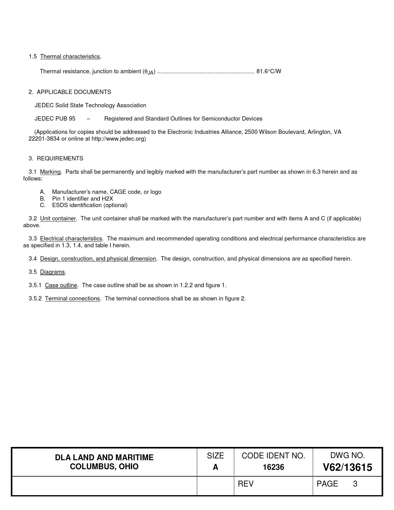 1.5 Thermal characteristics. Thermal resistance, junction to ambient (θJA) .. 81.6°C/W 2. APPLICABLE DOCUMENTS JEDEC Solid State Technology Association JEDEC PUB 95 – Registered and Standard Outlines for Semiconductor Devices (Applications for copies should be addressed to the Electronic Industries Alliance, 2500 Wilson Boulevard, Arlington, VA 22201-3834 or online at http://www.jedec.org) 3. REQUIREMENTS 3.1 Marking. Parts shall be permanently and legibly marked with the manufacturer’s part number as shown in 6.3 herein and as follows: A. Manufacturer’s name, CAGE code, or logo B. Pin 1 identifier and H2X C. ESDS identification (optional) 3.2 Unit container. The unit container shall be marked with the manufacturer’s part number and with items A and C (if applicable) above. 3.3 Electrical characteristics. The maximum and recommended operating conditions and electrical performance characteristics are as specified in 1.3, 1.4, and table I herein. 3.4 Design, construction, and physical dimension. The design, construction, and physical dimensions are as specified herein. 3.5 Diagrams. 3.5.1 Case outline. The case outline shall be as shown in 1.2.2 and figure 1. 3.5.2 Terminal connections. The terminal connections shall be as shown in figure 2.