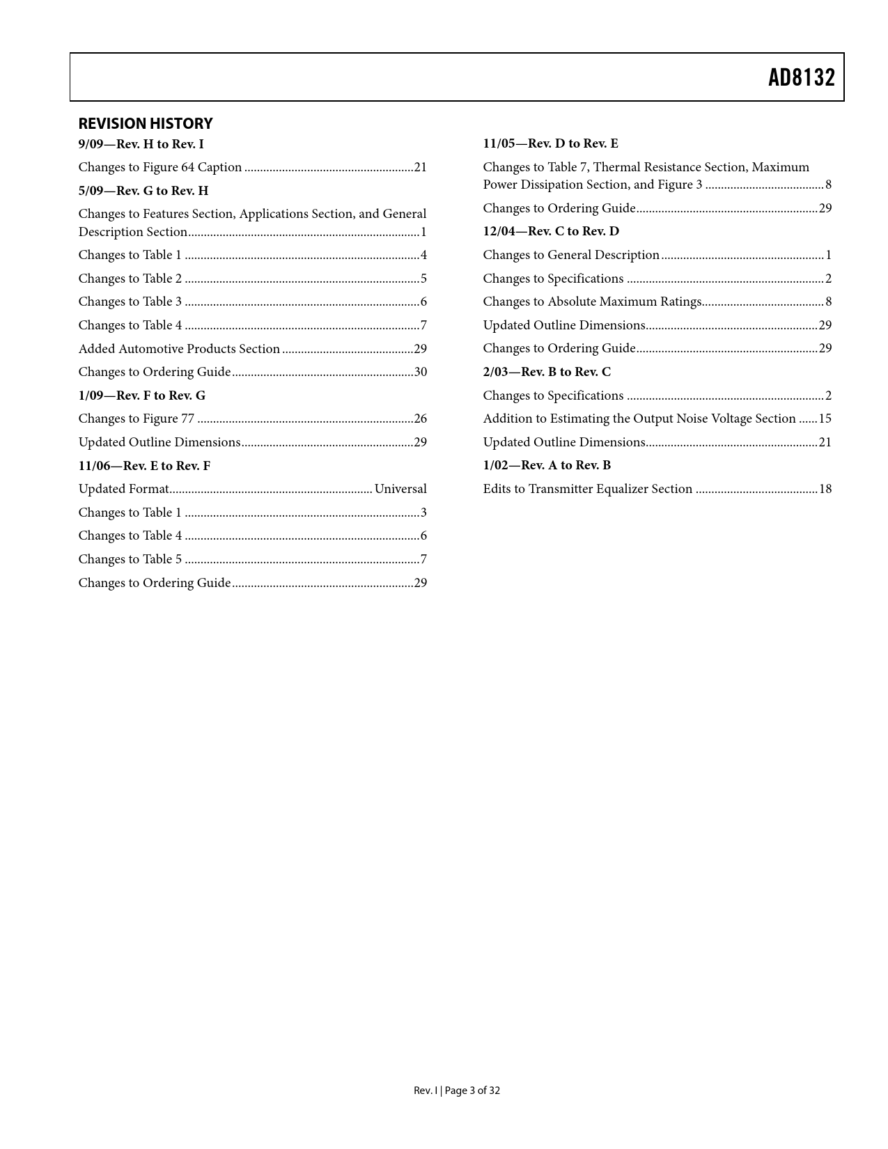 AD8132REVISION HISTORY 9/09—Rev. H to Rev. I11/05—Rev. D to Rev. E Changes to Figure 64 Caption .. 21 Changes to Table 7, Thermal Resistance Section, Maximum 5/09—Rev. G to Rev. H Power Dissipation Section, and Figure 3 .. 8 Changes to Features Section, Applications Section, and General Changes to Ordering Guide .. 29 Description Section .. 1 12/04—Rev. C to Rev. D Changes to Table 1 ... 4 Changes to General Description .. 1 Changes to Table 2 ... 5 Changes to Specifications ... 2 Changes to Table 3 ... 6 Changes to Absolute Maximum Ratings... 8 Changes to Table 4 ... 7 Updated Outline Dimensions ... 29 Added Automotive Products Section .. 29 Changes to Ordering Guide .. 29 Changes to Ordering Guide .. 30 2/03—Rev. B to Rev. C1/09—Rev. F to Rev. G Changes to Specifications ... 2 Changes to Figure 77 ... 26 Addition to Estimating the Output Noise Voltage Section .. 15 Updated Outline Dimensions ... 29 Updated Outline Dimensions ... 21 11/06—Rev. E to Rev. F1/02—Rev. A to Rev. B Updated Format ... Universal Edits to Transmitter Equalizer Section ... 18 Changes to Table 1 ... 3 Changes to Table 4 ... 6 Changes to Table 5 ... 7 Changes to Ordering Guide .. 29 Rev. I | Page 3 of 32 Document Outline FEATURES APPLICATIONS GENERAL DESCRIPTION CONNECTION DIAGRAM TABLE OF CONTENTS REVISION HISTORY SPECIFICATIONS ±DIN TO ±OUT SPECIFICATIONS VOCM TO ±OUT SPECIFICATIONS ±DIN TO ±OUT SPECIFICATIONS VOCM TO ±OUT SPECIFICATIONS ±DIN TO ±OUT SPECIFICATIONS VOCM TO ±OUT SPECIFICATIONS ABSOLUTE MAXIMUM RATINGS THERMAL RESISTANCE MAXIMUM POWER DISSIPATION ESD CAUTION PIN CONFIGURATION AND FUNCTION DESCRIPTIONS TYPICAL PERFORMANCE CHARACTERISTICS TEST CIRCUITS OPERATIONAL DESCRIPTION DEFINITION OF TERMS Differential Voltage Common-Mode Voltage BASIC CIRCUIT OPERATION THEORY OF OPERATION GENERAL USAGE OF THE AD8132 DIFFERENTIAL AMPLIFIER WITHOUT RESISTORS (HIGH INPUT IMPEDANCE INVERTING AMPLIFIER) OTHER β2 = 1 CIRCUITS VARYING β2 β1 = 0 ESTIMATING THE OUTPUT NOISE VOLTAGE CALCULATING INPUT IMPEDANCE OF THE APPLICATION CIRCUIT INPUT COMMON-MODE VOLTAGE RANGE IN SINGLE-SUPPLY APPLICATIONS SETTING THE OUTPUT COMMON-MODE VOLTAGE DRIVING A CAPACITIVE LOAD OPEN-LOOP GAIN AND PHASE LAYOUT, GROUNDING, AND BYPASSING CIRCUITS APPLICATIONS INFORMATION ANALOG-TO-DIGITAL DRIVER BALANCED CABLE DRIVER TRANSMIT EQUALIZER LOW-PASS DIFFERENTIAL FILTER HIGH COMMON-MODE OUTPUT IMPEDANCE AMPLIFIER FULL-WAVE RECTIFIER AUTOMOTIVE PRODUCTS OUTLINE DIMENSIONS ORDERING GUIDE
