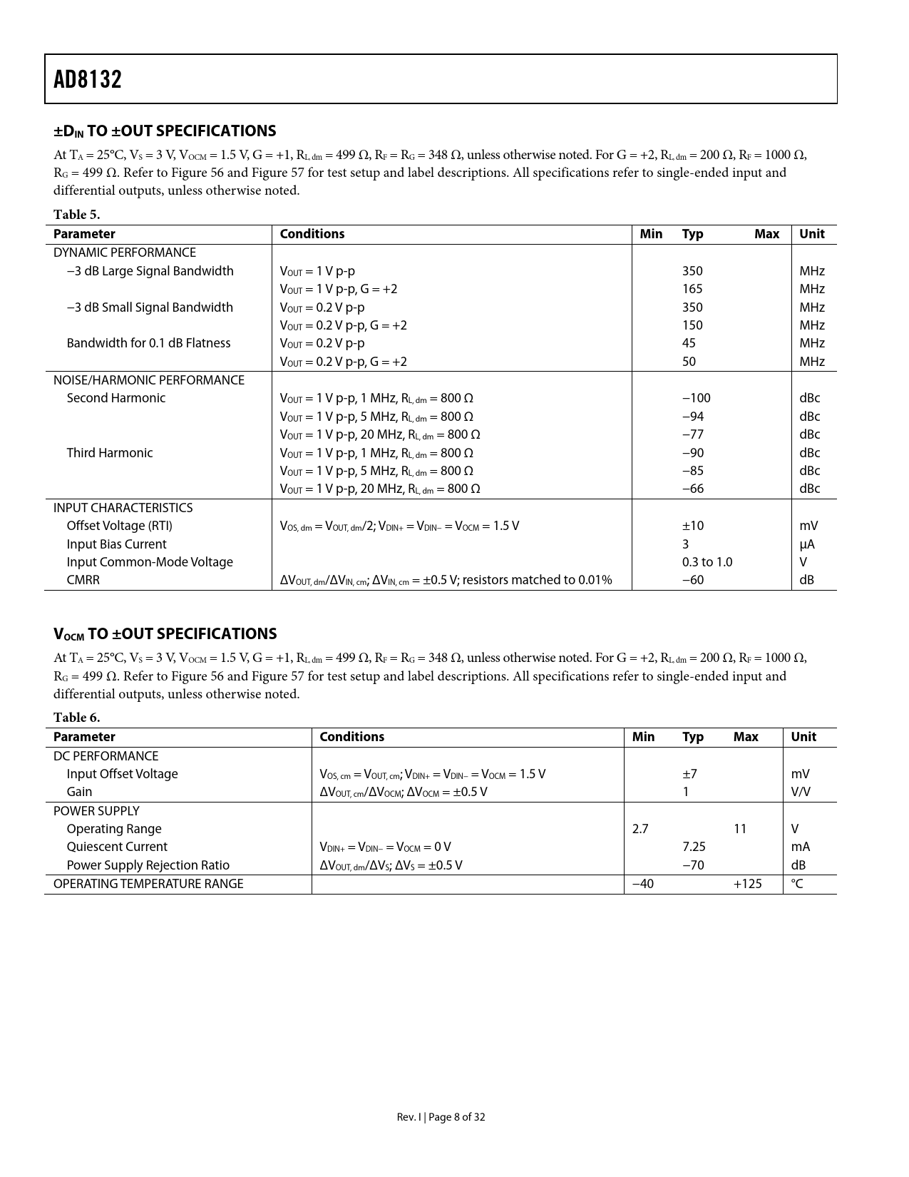 link to page 21 link to page 21 link to page 21 link to page 21 AD8132±DIN TO ±OUT SPECIFICATIONS At TA = 25°C, VS = 3 V, VOCM = 1.5 V, G = +1, RL, dm = 499 Ω, RF = RG = 348 Ω, unless otherwise noted. For G = +2, RL, dm = 200 Ω, RF = 1000 Ω, RG = 499 Ω. Refer to Figure 56 and Figure 57 for test setup and label descriptions. All specifications refer to single-ended input and differential outputs, unless otherwise noted. Table 5. Parameter ConditionsMinTypMaxUnit DYNAMIC PERFORMANCE −3 dB Large Signal Bandwidth VOUT = 1 V p-p 350 MHz VOUT = 1 V p-p, G = +2 165 MHz −3 dB Small Signal Bandwidth VOUT = 0.2 V p-p 350 MHz VOUT = 0.2 V p-p, G = +2 150 MHz Bandwidth for 0.1 dB Flatness VOUT = 0.2 V p-p 45 MHz VOUT = 0.2 V p-p, G = +2 50 MHz NOISE/HARMONIC PERFORMANCE Second Harmonic VOUT = 1 V p-p, 1 MHz, RL, dm = 800 Ω −100 dBc VOUT = 1 V p-p, 5 MHz, RL, dm = 800 Ω −94 dBc VOUT = 1 V p-p, 20 MHz, RL, dm = 800 Ω −77 dBc Third Harmonic VOUT = 1 V p-p, 1 MHz, RL, dm = 800 Ω −90 dBc VOUT = 1 V p-p, 5 MHz, RL, dm = 800 Ω −85 dBc VOUT = 1 V p-p, 20 MHz, RL, dm = 800 Ω −66 dBc INPUT CHARACTERISTICS Offset Voltage (RTI) VOS, dm = VOUT, dm/2; VDIN+ = VDIN− = VOCM = 1.5 V ±10 mV Input Bias Current 3 μA Input Common-Mode Voltage 0.3 to 1.0 V CMRR ΔVOUT, dm/ΔVIN, cm; ΔVIN, cm = ±0.5 V; resistors matched to 0.01% −60 dB VOCM TO ±OUT SPECIFICATIONS At TA = 25°C, VS = 3 V, VOCM = 1.5 V, G = +1, RL, dm = 499 Ω, RF = RG = 348 Ω, unless otherwise noted. For G = +2, RL, dm = 200 Ω, RF = 1000 Ω, RG = 499 Ω. Refer to Figure 56 and Figure 57 for test setup and label descriptions. All specifications refer to single-ended input and differential outputs, unless otherwise noted. Table 6. Parameter ConditionsMinTypMaxUnit DC PERFORMANCE Input Offset Voltage VOS, cm = VOUT, cm; VDIN+ = VDIN− = VOCM = 1.5 V ±7 mV Gain ΔVOUT, cm/ΔVOCM; ΔVOCM = ±0.5 V 1 V/V POWER SUPPLY Operating Range 2.7 11 V Quiescent Current VDIN+ = VDIN− = VOCM = 0 V 7.25 mA Power Supply Rejection Ratio ΔVOUT, dm/ΔVS; ΔVS = ±0.5 V −70 dB OPERATING TEMPERATURE RANGE −40 +125 °C Rev. I | Page 8 of 32 Document Outline FEATURES APPLICATIONS GENERAL DESCRIPTION CONNECTION DIAGRAM TABLE OF CONTENTS REVISION HISTORY SPECIFICATIONS ±DIN TO ±OUT SPECIFICATIONS VOCM TO ±OUT SPECIFICATIONS ±DIN TO ±OUT SPECIFICATIONS VOCM TO ±OUT SPECIFICATIONS ±DIN TO ±OUT SPECIFICATIONS VOCM TO ±OUT SPECIFICATIONS ABSOLUTE MAXIMUM RATINGS THERMAL RESISTANCE MAXIMUM POWER DISSIPATION ESD CAUTION PIN CONFIGURATION AND FUNCTION DESCRIPTIONS TYPICAL PERFORMANCE CHARACTERISTICS TEST CIRCUITS OPERATIONAL DESCRIPTION DEFINITION OF TERMS Differential Voltage Common-Mode Voltage BASIC CIRCUIT OPERATION THEORY OF OPERATION GENERAL USAGE OF THE AD8132 DIFFERENTIAL AMPLIFIER WITHOUT RESISTORS (HIGH INPUT IMPEDANCE INVERTING AMPLIFIER) OTHER β2 = 1 CIRCUITS VARYING β2 β1 = 0 ESTIMATING THE OUTPUT NOISE VOLTAGE CALCULATING INPUT IMPEDANCE OF THE APPLICATION CIRCUIT INPUT COMMON-MODE VOLTAGE RANGE IN SINGLE-SUPPLY APPLICATIONS SETTING THE OUTPUT COMMON-MODE VOLTAGE DRIVING A CAPACITIVE LOAD OPEN-LOOP GAIN AND PHASE LAYOUT, GROUNDING, AND BYPASSING CIRCUITS APPLICATIONS INFORMATION ANALOG-TO-DIGITAL DRIVER BALANCED CABLE DRIVER TRANSMIT EQUALIZER LOW-PASS DIFFERENTIAL FILTER HIGH COMMON-MODE OUTPUT IMPEDANCE AMPLIFIER FULL-WAVE RECTIFIER AUTOMOTIVE PRODUCTS OUTLINE DIMENSIONS ORDERING GUIDE