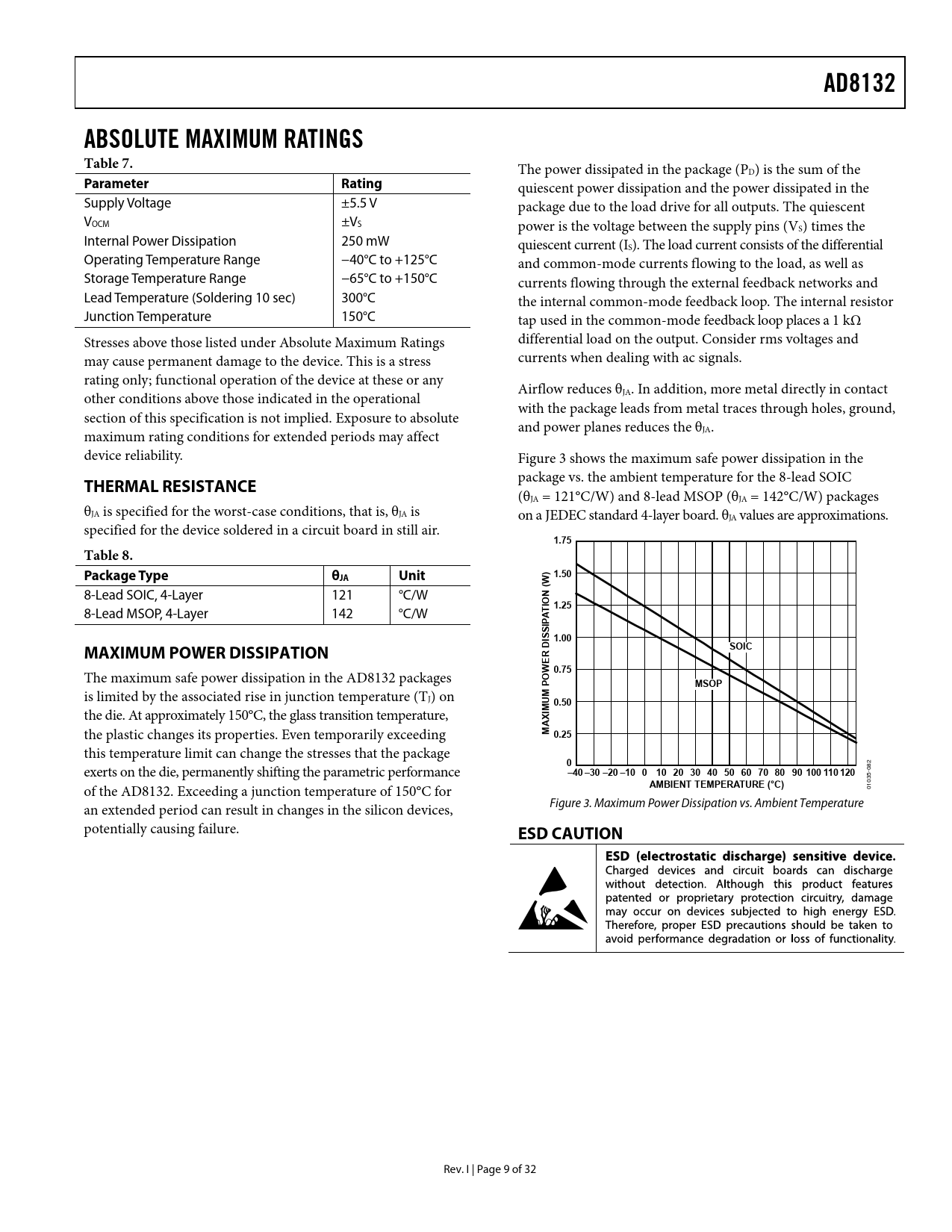 link to page 10 AD8132ABSOLUTE MAXIMUM RATINGS Table 7. The power dissipated in the package (PD) is the sum of the Parameter Rating quiescent power dissipation and the power dissipated in the Supply Voltage ±5.5 V package due to the load drive for all outputs. The quiescent VOCM ±VS power is the voltage between the supply pins (VS) times the Internal Power Dissipation 250 mW quiescent current (IS). The load current consists of the differential Operating Temperature Range −40°C to +125°C and common-mode currents flowing to the load, as well as Storage Temperature Range −65°C to +150°C currents flowing through the external feedback networks and Lead Temperature (Soldering 10 sec) 300°C the internal common-mode feedback loop. The internal resistor Junction Temperature 150°C tap used in the common-mode feedback loop places a 1 kΩ differential load on the output. Consider rms voltages and Stresses above those listed under Absolute Maximum Ratings currents when dealing with ac signals. may cause permanent damage to the device. This is a stress rating only; functional operation of the device at these or any Airflow reduces θJA. In addition, more metal directly in contact other conditions above those indicated in the operational with the package leads from metal traces through holes, ground, section of this specification is not implied. Exposure to absolute and power planes reduces the θJA. maximum rating conditions for extended periods may affect device reliability. Figure 3 shows the maximum safe power dissipation in the package vs. the ambient temperature for the 8-lead SOIC THERMAL RESISTANCE (θJA = 121°C/W) and 8-lead MSOP (θJA = 142°C/W) packages θJA is specified for the worst-case conditions, that is, θJA is on a JEDEC standard 4-layer board. θJA values are approximations. specified for the device soldered in a circuit board in still air. 1.75Table 8.) 1.50Package TypeθJA UnitW ( 8-Lead SOIC, 4-Layer 121 °C/W ION T 1.25 8-Lead MSOP, 4-Layer 142 °C/W A IPISS 1.00DSOICMAXIMUM POWER DISSIPATIONR E W 0.75O The maximum safe power dissipation in the AD8132 packages MSOPM P is limited by the associated rise in junction temperature (TJ) on 0.50IMU the die. At approximately 150°C, the glass transition temperature, X MA 0.25 the plastic changes its properties. Even temporarily exceeding this temperature limit can change the stresses that the package 0 82 –40 –30 –20 –10 0 10 20 30 40 50 60 70 80 90 100 110 120 0 5- exerts on the die, permanently shifting the parametric performance AMBIENT TEMPERATURE (°C) 03 01 of the AD8132. Exceeding a junction temperature of 150°C for Figure 3. Maximum Power Dissipation vs. Ambient Temperature an extended period can result in changes in the silicon devices, potentially causing failure. ESD CAUTION Rev. I | Page 9 of 32 Document Outline FEATURES APPLICATIONS GENERAL DESCRIPTION CONNECTION DIAGRAM TABLE OF CONTENTS REVISION HISTORY SPECIFICATIONS ±DIN TO ±OUT SPECIFICATIONS VOCM TO ±OUT SPECIFICATIONS ±DIN TO ±OUT SPECIFICATIONS VOCM TO ±OUT SPECIFICATIONS ±DIN TO ±OUT SPECIFICATIONS VOCM TO ±OUT SPECIFICATIONS ABSOLUTE MAXIMUM RATINGS THERMAL RESISTANCE MAXIMUM POWER DISSIPATION ESD CAUTION PIN CONFIGURATION AND FUNCTION DESCRIPTIONS TYPICAL PERFORMANCE CHARACTERISTICS TEST CIRCUITS OPERATIONAL DESCRIPTION DEFINITION OF TERMS Differential Voltage Common-Mode Voltage BASIC CIRCUIT OPERATION THEORY OF OPERATION GENERAL USAGE OF THE AD8132 DIFFERENTIAL AMPLIFIER WITHOUT RESISTORS (HIGH INPUT IMPEDANCE INVERTING AMPLIFIER) OTHER β2 = 1 CIRCUITS VARYING β2 β1 = 0 ESTIMATING THE OUTPUT NOISE VOLTAGE CALCULATING INPUT IMPEDANCE OF THE APPLICATION CIRCUIT INPUT COMMON-MODE VOLTAGE RANGE IN SINGLE-SUPPLY APPLICATIONS SETTING THE OUTPUT COMMON-MODE VOLTAGE DRIVING A CAPACITIVE LOAD OPEN-LOOP GAIN AND PHASE LAYOUT, GROUNDING, AND BYPASSING CIRCUITS APPLICATIONS INFORMATION ANALOG-TO-DIGITAL DRIVER BALANCED CABLE DRIVER TRANSMIT EQUALIZER LOW-PASS DIFFERENTIAL FILTER HIGH COMMON-MODE OUTPUT IMPEDANCE AMPLIFIER FULL-WAVE RECTIFIER AUTOMOTIVE PRODUCTS OUTLINE DIMENSIONS ORDERING GUIDE