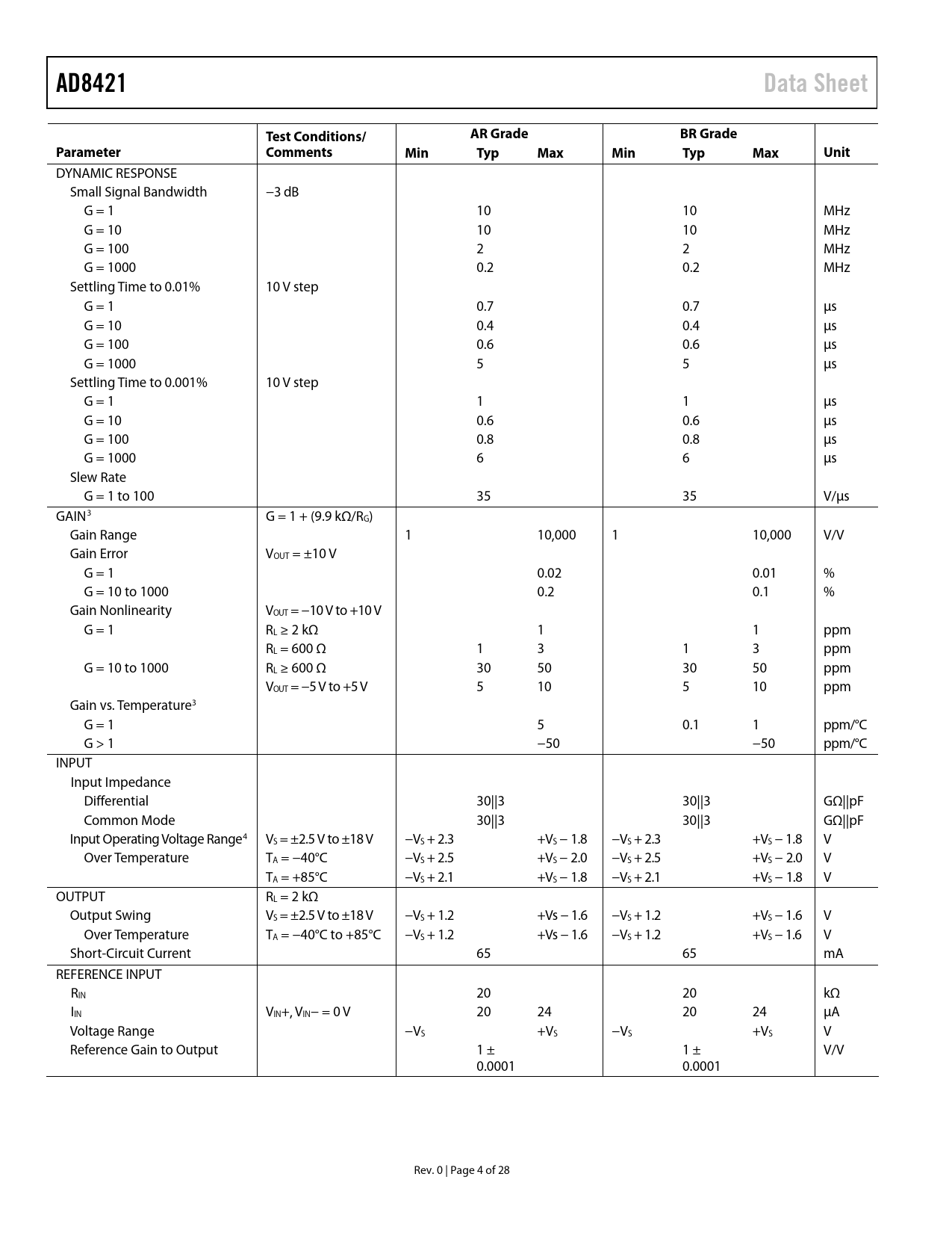 AD8421. Data Sheet. AR Grade. BR Grade. Test Conditions/. Parameter. Comments. Min Typ. Max Min Typ Max Unit