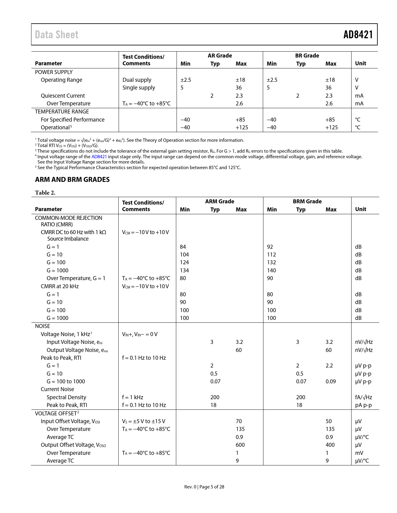 Data Sheet. AD8421. AR Grade. BR Grade. Test Conditions/. Parameter. Comments. Min Typ. Max Min Typ Max Unit. ARM AND BRM GRADES. Table 2