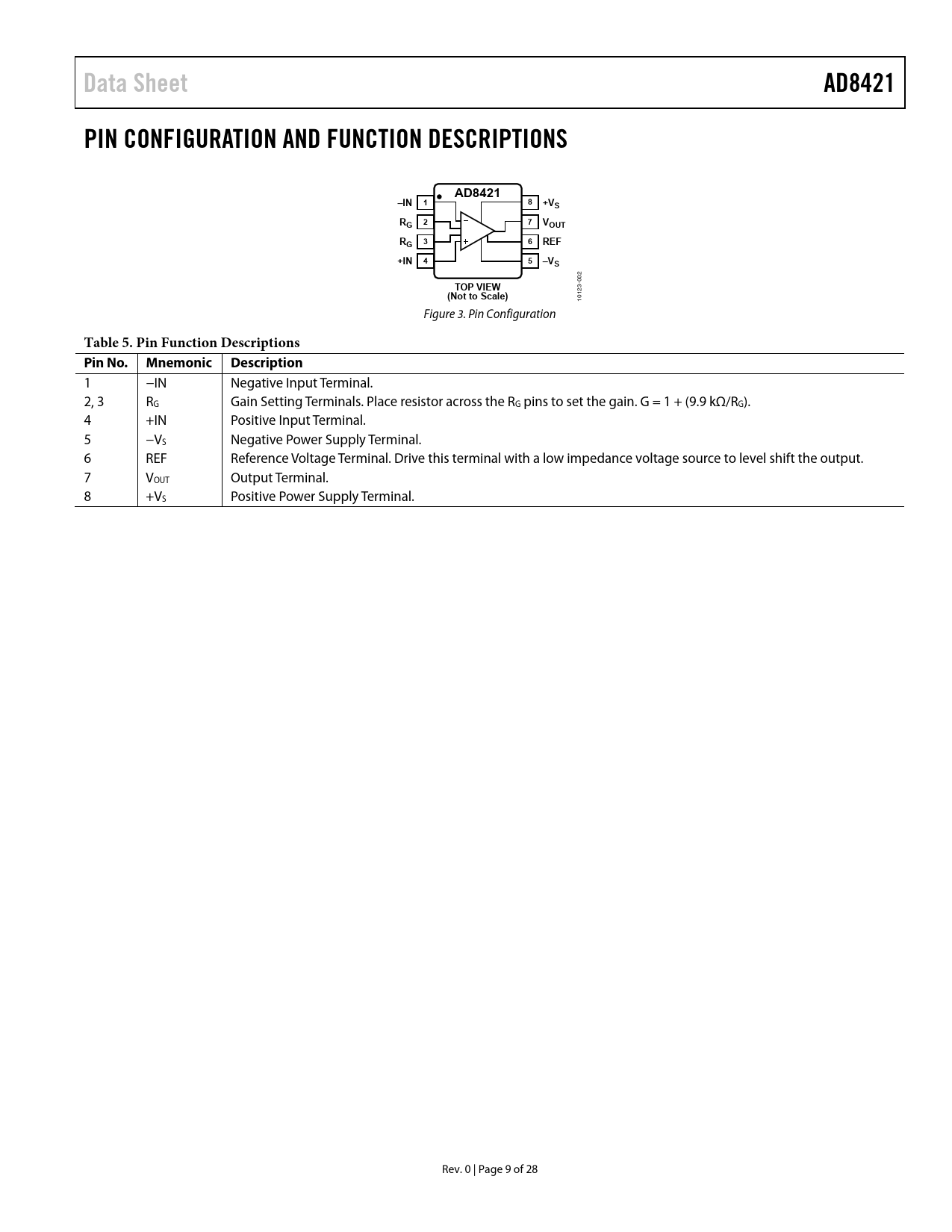 Data Sheet AD8421 PIN CONFIGURATION AND FUNCTION DESCRIPTIONS AD8421 –IN 1 8 +VS RG 2 7 VOUT RG 3 6 REF +IN 4 5 –VS