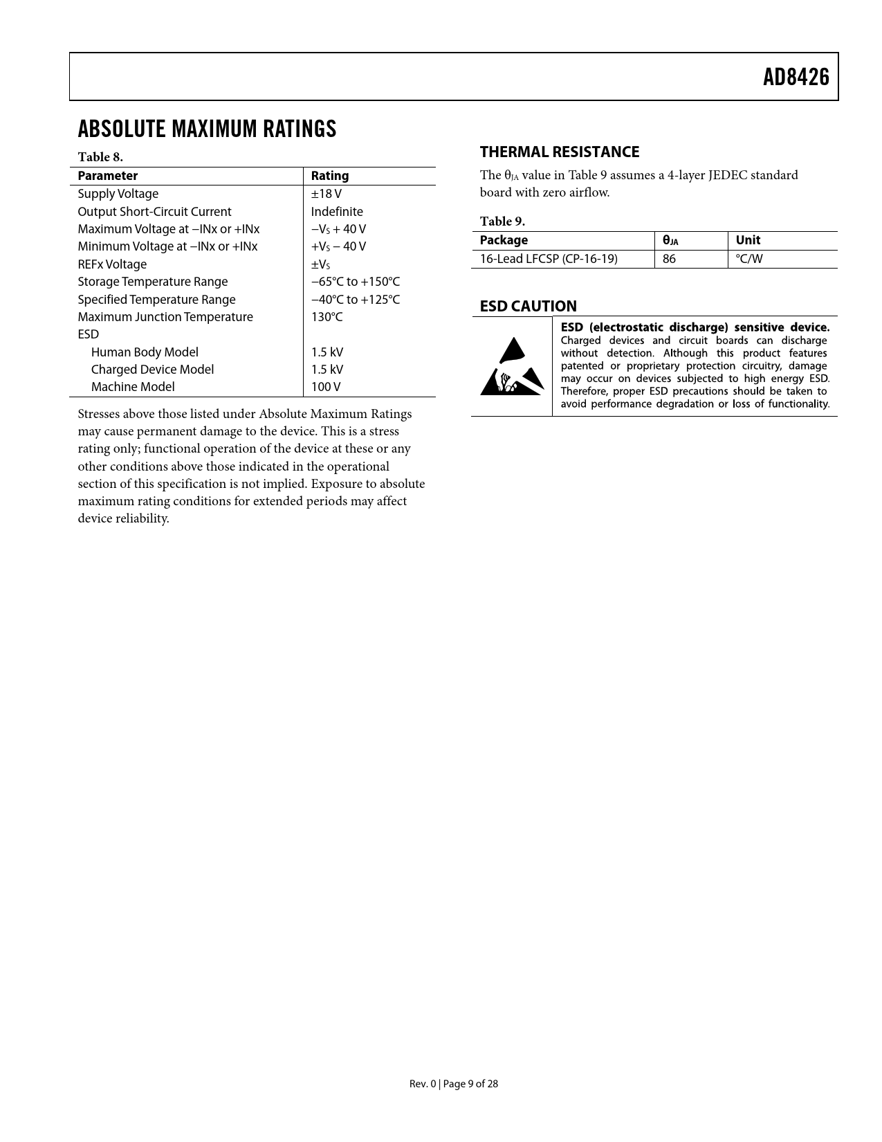 AD8426 ABSOLUTE MAXIMUM RATINGS THERMAL RESISTANCE Table 8 Parameter Rating Table 9 Package θ JA Unit ESD CAUTION