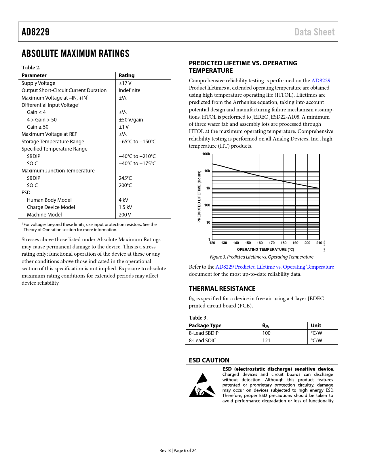 link to page 18 link to page 7 link to page 7 AD8229Data SheetABSOLUTE MAXIMUM RATINGSPREDICTED LIFETIME VS. OPERATINGTable 2.TEMPERATUREParameterRating Supply Voltage ±17 V Comprehensive reliability testing is performed on the AD8229. Output Short-Circuit Current Duration Indefinite Product lifetimes at extended operating temperature are obtained Maximum Voltage at –IN, +IN1 ±V using high temperature operating life (HTOL). Lifetimes are S Differential Input Voltage1 predicted from the Arrhenius equation, taking into account Gain ≤ 4 ±V potential design and manufacturing failure mechanism assump- S 4 > Gain > 50 ±50 V/gain tions. HTOL is performed to JEDEC JESD22-A108. A minimum Gain ≥ 50 ±1 V of three wafer fab and assembly lots are processed through Maximum Voltage at REF ±V HTOL at the maximum operating temperature. Comprehensive S Storage Temperature Range −65°C to +150°C reliability testing is performed on all Analog Devices, Inc., high Specified Temperature Range temperature (HT) products. SBDIP −40°C to +210°C 100k SOIC −40°C to +175°C Maximum Junction Temperature )10ks SBDIP 245°C our H SOIC 200°C ( E1k ESD TIM Human Body Model 4 kV LIFE D Charge Device Model 1.5 kV 100TE Machine Model 200 V IC D E R P 1 For voltages beyond these limits, use input protection resistors. See the 10 Theory of Operation section for more information. Stresses above those listed under Absolute Maximum Ratings 1120130140150160170180190200210 may cause permanent damage to the device. This is a stress 200 OPERATING TEMPERATURE (°C) rating only; functional operation of the device at these or any 09412- Figure 3. Predicted Lifetime vs. Operating Temperature other conditions above those indicated in the operational section of this specification is not implied. Exposure to absolute Refer to the AD8229 Predicted Lifetime vs. Operating Temperature maximum rating conditions for extended periods may affect document for the most up-to-date reliability data. device reliability. THERMAL RESISTANCE θJA is specified for a device in free air using a 4-layer JEDEC printed circuit board (PCB). Table 3. Package TypeθJAUnit 8-Lead SBDIP 100 °C/W 8-Lead SOIC 121 °C/W ESD CAUTION Rev. B | Page 6 of 24 Document Outline Features Applications Functional Block Diagram General Description Revision History Specifications Absolute Maximum Ratings Predicted Lifetime vs. Operating Temperature Thermal Resistance ESD Caution Pin Configuration and Function Descriptions Typical Performance Characteristics Theory of Operation Architecture Gain Selection RG Power Dissipation Reference Terminal Input Voltage Range Layout Common-Mode Rejection Ratio over Frequency Power Supplies Reference Pin Input Bias Current Return Path Input Protection Input Voltages Beyond the Rails Large Differential Input Voltage at High Gain IMAX Radio Frequency Interference (RFI) Calculating the Noise of the Input Stage Source Resistance Noise Voltage Noise of the Instrumentation Amplifier Current Noise of the Instrumentation Amplifier Total Noise Density Calculation Outline Dimensions Ordering Guide