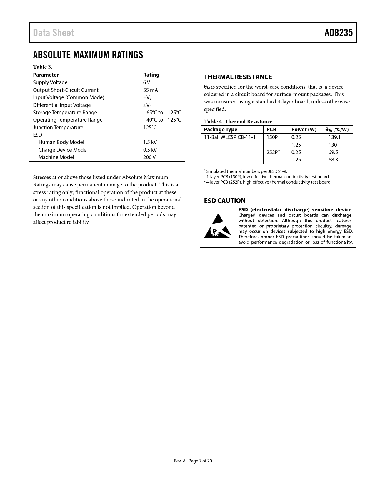 Data Sheet AD8235 ABSOLUTE MAXIMUM RATINGS Table 3 Parameter Rating THERMAL RESISTANCE Table 4 Thermal Resistance