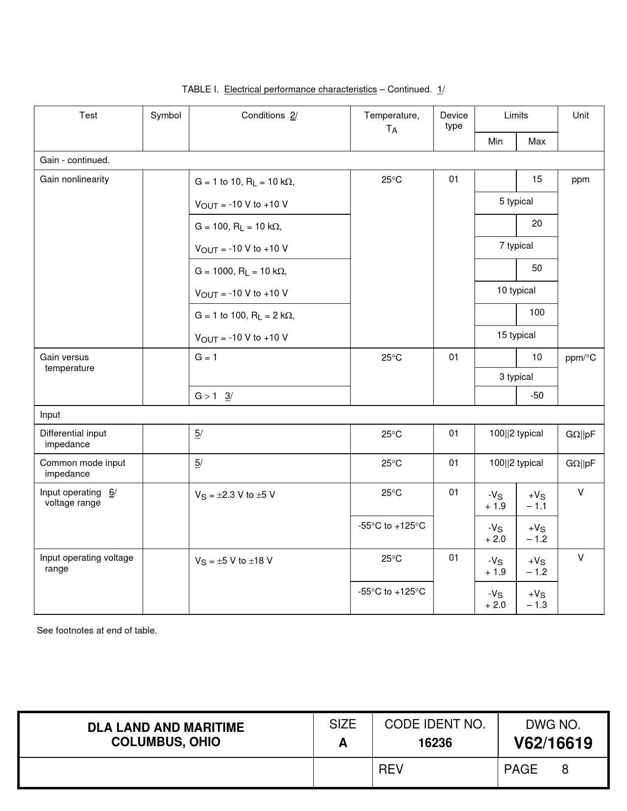 TABLE I. Electrical performance characteristics – Continued. 1/ Test Symbol Conditions 2/ Temperature, Device Limits Unit T type A Min Max Gain - continued. Gain nonlinearity G = 1 to 10, RL = 10 k, 25C 01 15 ppm VOUT = -10 V to +10 V 5 typical G = 100, RL = 10 k, 20 VOUT = -10 V to +10 V 7 typical G = 1000, RL = 10 k, 50 VOUT = -10 V to +10 V 10 typical G = 1 to 100, RL = 2 k, 100 VOUT = -10 V to +10 V 15 typical Gain versus G = 1 25C 01 10 ppm/C temperature 3 typical G  1 3/ -50 Input Differential input 5/ 25C 01 100||2 typical G||pF impedance Common mode input 5/ 25C 01 100||2 typical G||pF impedance Input operating 6/ V V S = 2.3 V to 5 V 25C 01 -VS +VS voltage range + 1.9 – 1.1 -55C to +125C -V S +VS + 2.0 – 1.2 Input operating voltage V V S = 5 V to 18 V 25C 01 -VS +VS range + 1.9 – 1.2 -55C to +125C -V S +VS + 2.0 – 1.3 See footnotes at end of table.