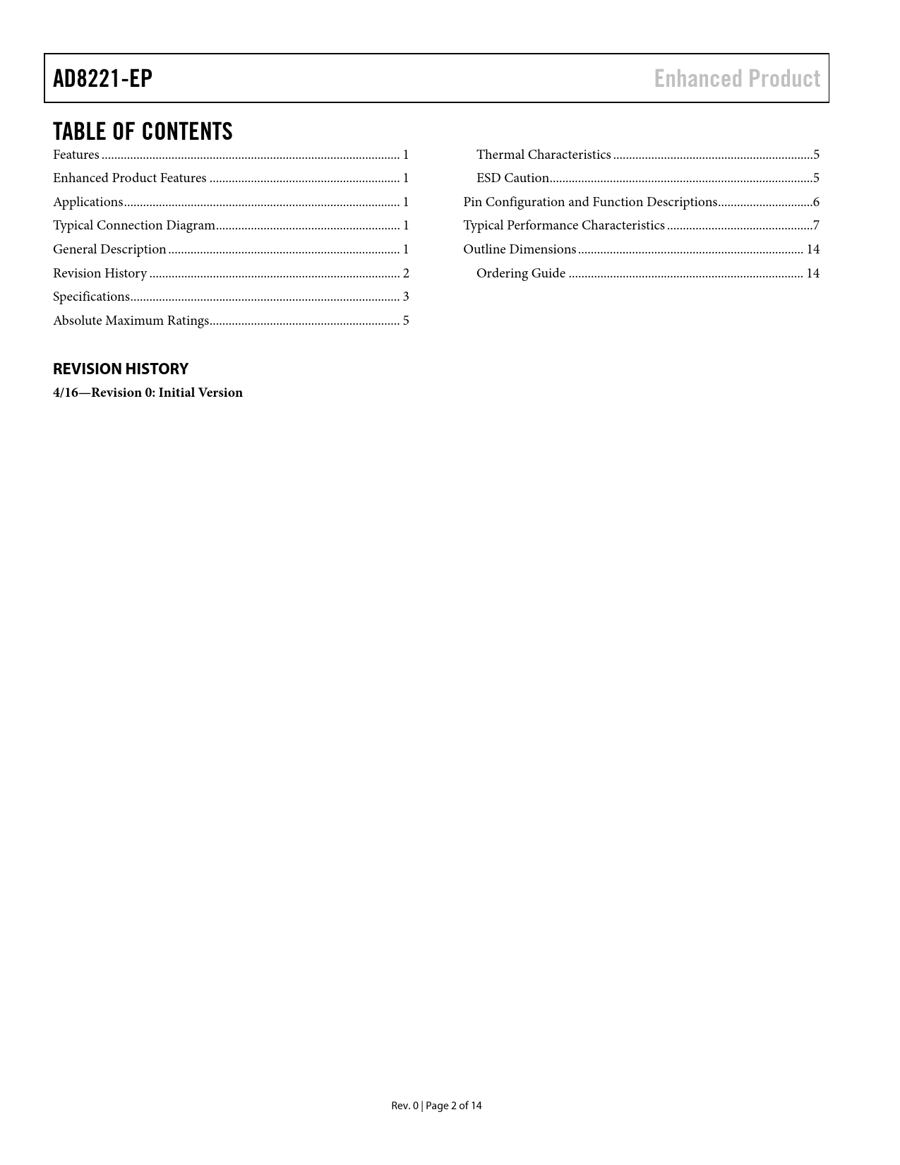 页数 / 页14 / 2 — AD8221-EP. Enhanced Product. TABLE OF CONTENTS. REVISION HISTORY. …