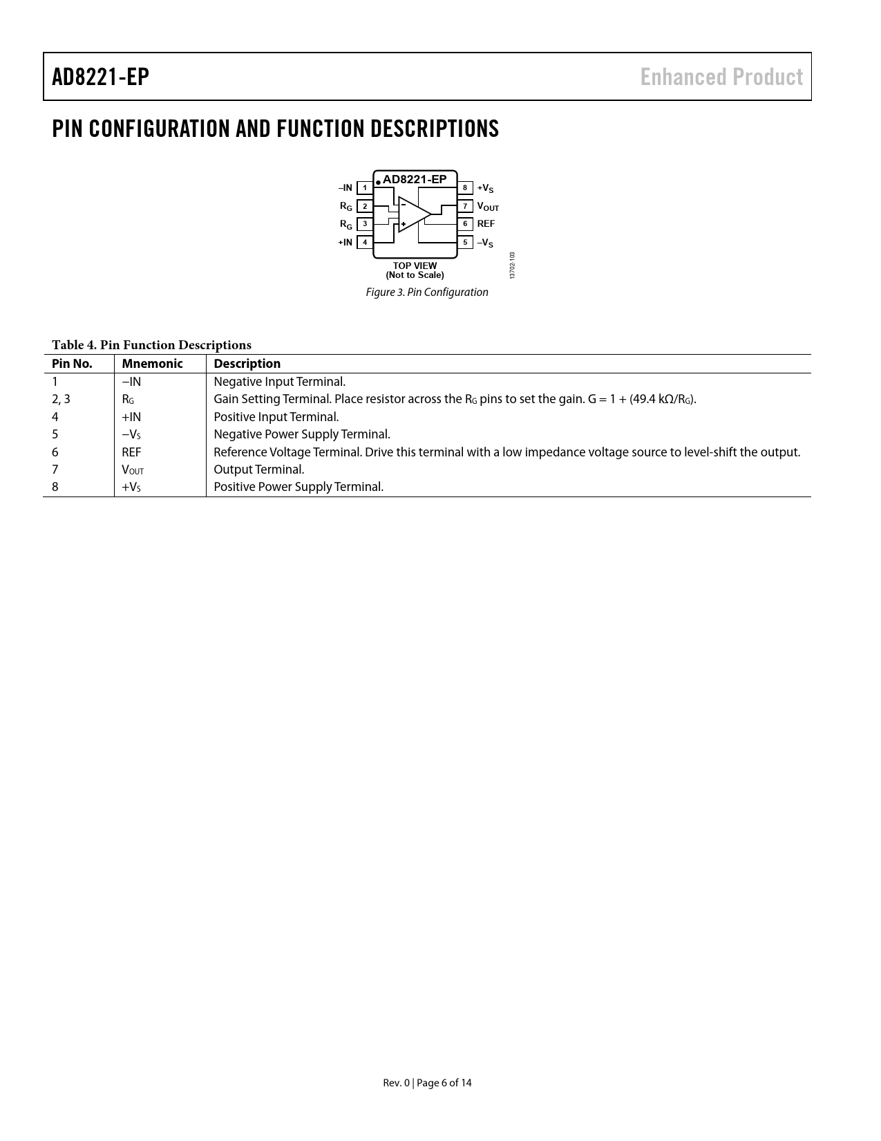 AD8221-EP. Enhanced Product. PIN CONFIGURATION AND FUNCTION DESCRIPTIONS. –IN. +VS. RG 2. VOUT. RG 3. REF. +IN. –VS. TOP VIEW. (Not to Scale)