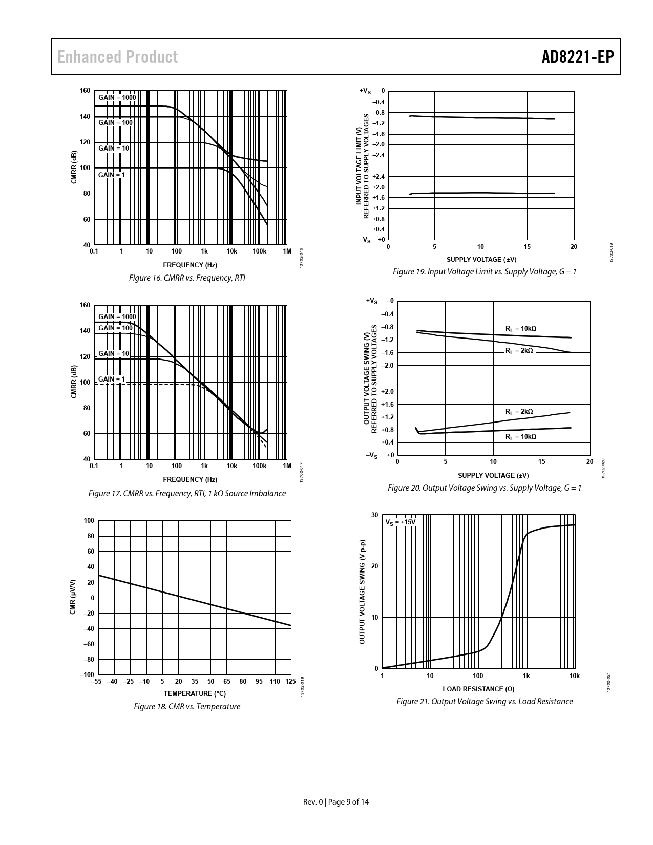 Enhanced Product. AD8221-EP. 160. +VS –0. GAIN = 1000. –0.4. –0.8. 140. GAIN = 100. E –1.2. V (. –1.6. LTA. 120. O –2.0. GAIN = 10. IMI. LY –2.4. P P. 100
