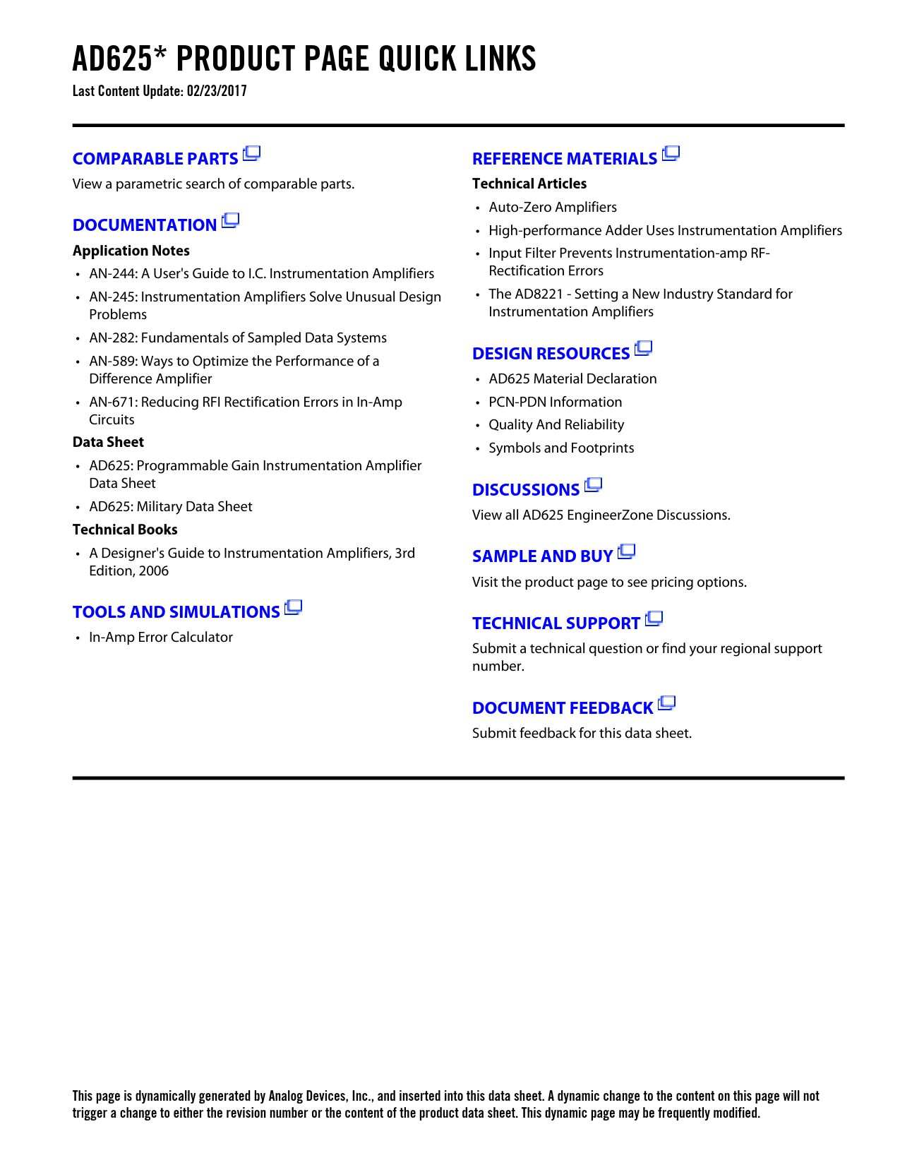 AD625* PRODUCT PAGE QUICK LINKS Last Content Update: 02/23/2017COMPARABLE PARTSREFERENCE MATERIALS View a parametric search of comparable parts. Technical Articles • Auto-Zero Amplifiers DOCUMENTATION • High-performance Adder Uses Instrumentation Amplifiers Application Notes • Input Filter Prevents Instrumentation-amp RF- • AN-244: A User's Guide to I.C. Instrumentation Amplifiers Rectification Errors • AN-245: Instrumentation Amplifiers Solve Unusual Design • The AD8221 - Setting a New Industry Standard for Problems Instrumentation Amplifiers • AN-282: Fundamentals of Sampled Data Systems • AN-589: Ways to Optimize the Performance of a DESIGN RESOURCES Difference Amplifier • AD625 Material Declaration • AN-671: Reducing RFI Rectification Errors in In-Amp • PCN-PDN Information Circuits • Quality And Reliability Data Sheet • Symbols and Footprints • AD625: Programmable Gain Instrumentation Amplifier Data Sheet DISCUSSIONS • AD625: Military Data Sheet View all AD625 EngineerZone Discussions. Technical Books • A Designer's Guide to Instrumentation Amplifiers, 3rd SAMPLE AND BUY Edition, 2006 Visit the product page to see pricing options. TOOLS AND SIMULATIONSTECHNICAL SUPPORT • In-Amp Error Calculator Submit a technical question or find your regional support number. DOCUMENT FEEDBACK Submit feedback for this data sheet. This page is dynamically generated by Analog Devices, Inc., and inserted into this data sheet. A dynamic change to the content on this page will not trigger a change to either the revision number or the content of the product data sheet. This dynamic page may be frequently modified.