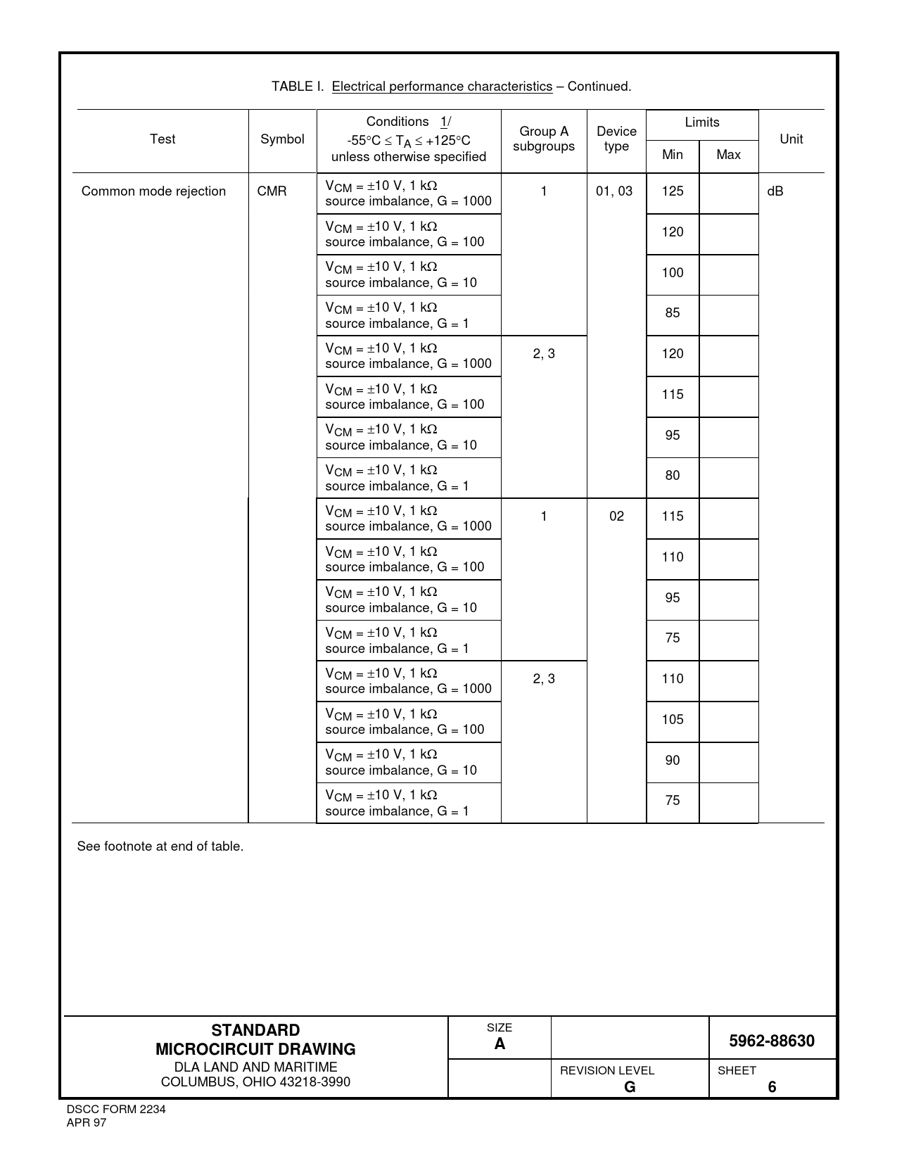 TABLE I. Electrical performance characteristics – Continued. Conditions 1/ Limits Group A Device Test Symbol -55°C ≤ TA ≤ +125°C Unit subgroups type unless otherwise specified Min Max Common mode rejection CMR VCM = ±10 V, 1 kΩ 1 01, 03 125 dB source imbalance, G = 1000 VCM = ±10 V, 1 kΩ 120 source imbalance, G = 100 VCM = ±10 V, 1 kΩ 100 source imbalance, G = 10 VCM = ±10 V, 1 kΩ 85 source imbalance, G = 1 VCM = ±10 V, 1 kΩ 2, 3 120 source imbalance, G = 1000 VCM = ±10 V, 1 kΩ 115 source imbalance, G = 100 VCM = ±10 V, 1 kΩ 95 source imbalance, G = 10 VCM = ±10 V, 1 kΩ 80 source imbalance, G = 1 VCM = ±10 V, 1 kΩ 1 02 115 source imbalance, G = 1000 VCM = ±10 V, 1 kΩ 110 source imbalance, G = 100 VCM = ±10 V, 1 kΩ 95 source imbalance, G = 10 VCM = ±10 V, 1 kΩ 75 source imbalance, G = 1 VCM = ±10 V, 1 kΩ 2, 3 110 source imbalance, G = 1000 VCM = ±10 V, 1 kΩ 105 source imbalance, G = 100 VCM = ±10 V, 1 kΩ 90 source imbalance, G = 10 VCM = ±10 V, 1 kΩ 75 source imbalance, G = 1 See footnote at end of table.