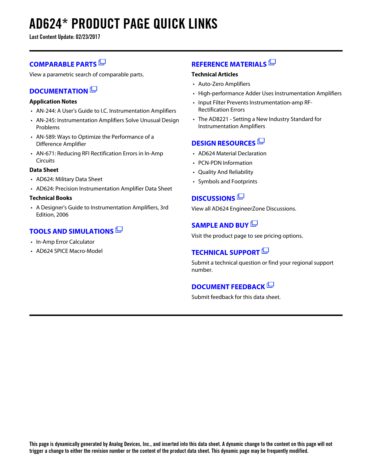 AD624* PRODUCT PAGE QUICK LINKS Last Content Update: 02/23/2017COMPARABLE PARTSREFERENCE MATERIALS View a parametric search of comparable parts. Technical Articles • Auto-Zero Amplifiers DOCUMENTATION • High-performance Adder Uses Instrumentation Amplifiers Application Notes • Input Filter Prevents Instrumentation-amp RF- • AN-244: A User's Guide to I.C. Instrumentation Amplifiers Rectification Errors • AN-245: Instrumentation Amplifiers Solve Unusual Design • The AD8221 - Setting a New Industry Standard for Problems Instrumentation Amplifiers • AN-589: Ways to Optimize the Performance of a Difference Amplifier DESIGN RESOURCES • AN-671: Reducing RFI Rectification Errors in In-Amp • AD624 Material Declaration Circuits • PCN-PDN Information Data Sheet • Quality And Reliability • AD624: Military Data Sheet • Symbols and Footprints • AD624: Precision Instrumentation Amplifier Data Sheet Technical BooksDISCUSSIONS • A Designer's Guide to Instrumentation Amplifiers, 3rd View all AD624 EngineerZone Discussions. Edition, 2006 SAMPLE AND BUYTOOLS AND SIMULATIONS Visit the product page to see pricing options. • In-Amp Error Calculator • AD624 SPICE Macro-Model TECHNICAL SUPPORT Submit a technical question or find your regional support number. DOCUMENT FEEDBACK Submit feedback for this data sheet. This page is dynamically generated by Analog Devices, Inc., and inserted into this data sheet. A dynamic change to the content on this page will not trigger a change to either the revision number or the content of the product data sheet. This dynamic page may be frequently modified.