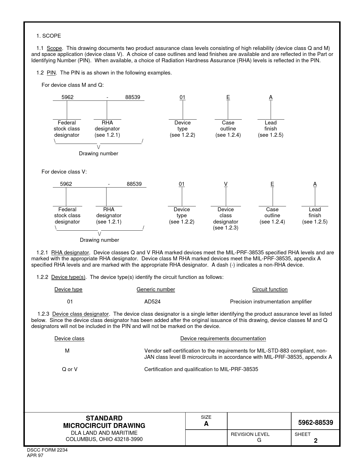 1. SCOPE 1.1 Scope. This drawing documents two product assurance class levels consisting of high reliability (device class Q and M) and space application (device class V). A choice of case outlines and lead finishes are available and are reflected in the Part or Identifying Number (PIN). When available, a choice of Radiation Hardness Assurance (RHA) levels is reflected in the PIN. 1.2 PIN. The PIN is as shown in the following examples. For device class M and Q: 5962 - 88539 01 E A Federal RHA Device Case Lead stock class designator type outline finish designator (see 1.2.1) (see 1.2.2) (see 1.2.4) (see 1.2.5) \ / \/ Drawing number For device class V: 5962 - 88539 01 V E A Federal RHA Device Device Case Lead stock class designator type class outline finish designator (see 1.2.1) (see 1.2.2) designator (see 1.2.4) (see 1.2.5) \ / (see 1.2.3) \/ Drawing number 1.2.1 RHA designator. Device classes Q and V RHA marked devices meet the MIL-PRF-38535 specified RHA levels and are marked with the appropriate RHA designator. Device class M RHA marked devices meet the MIL-PRF-38535, appendix A specified RHA levels and are marked with the appropriate RHA designator. A dash (-) indicates a non-RHA device. 1.2.2 Device type(s). The device type(s) identify the circuit function as follows: Device type Generic number Circuit function 01 AD524 Precision instrumentation amplifier 1.2.3 Device class designator. The device class designator is a single letter identifying the product assurance level as listed below. Since the device class designator has been added after the original issuance of this drawing, device classes M and Q designators will not be included in the PIN and will not be marked on the device. Device class Device requirements documentation M Vendor self-certification to the requirements for MIL-STD-883 compliant, non- JAN class level B microcircuits in accordance with MIL-PRF-38535, appendix A Q or V Certification and qualification to MIL-PRF-38535